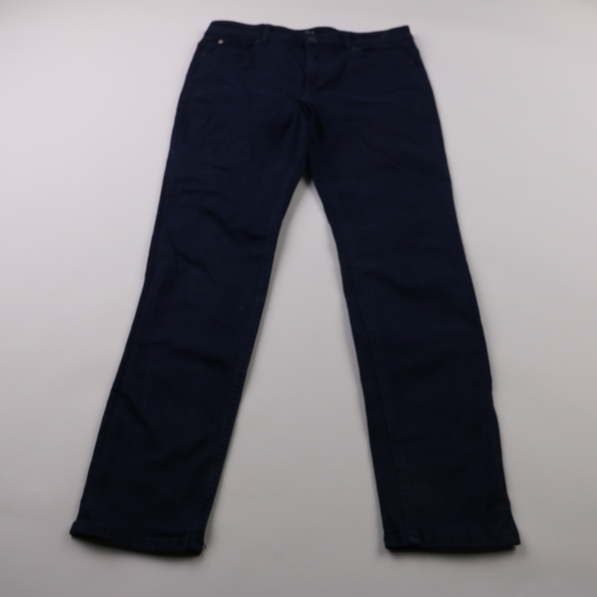 Женские брюки C&A тёмно-синего цвета, прямого кроя со застёжкой на пуговицу и молнию. Подойдут для офиса и повседневных образов с рубашкой, водолазкой или жакетом. Плотная ткань хорошо держит форму и практична в уходе.