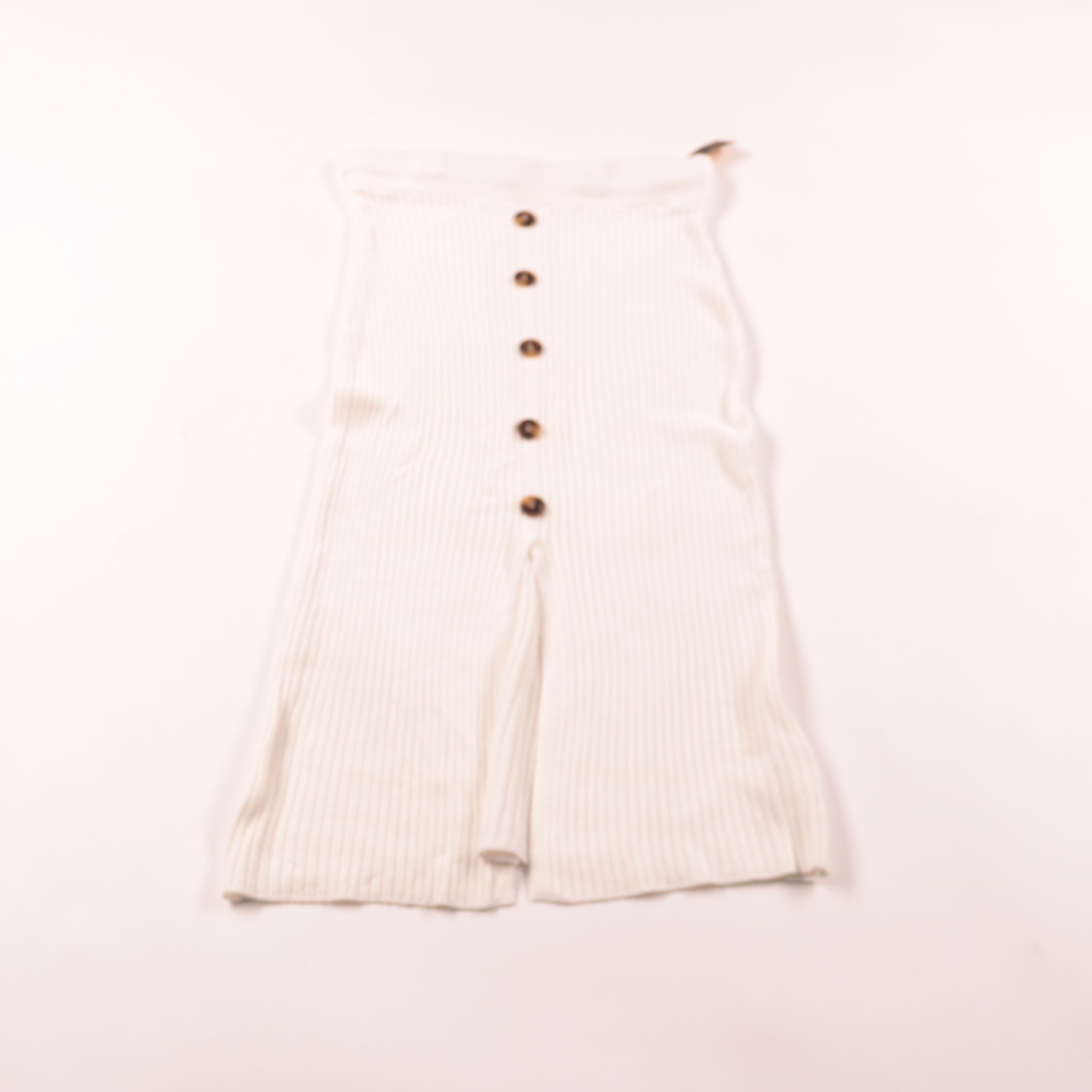 Белые трикотажные брюки Miss Eleven в рубчик с высокой посадкой и декоративными пуговицами спереди. Подойдут для летних прогулок и отдыха, хорошо сочетаются с топами и футболками. Эластичная ткань комфортно тянется и не сковывает движения.