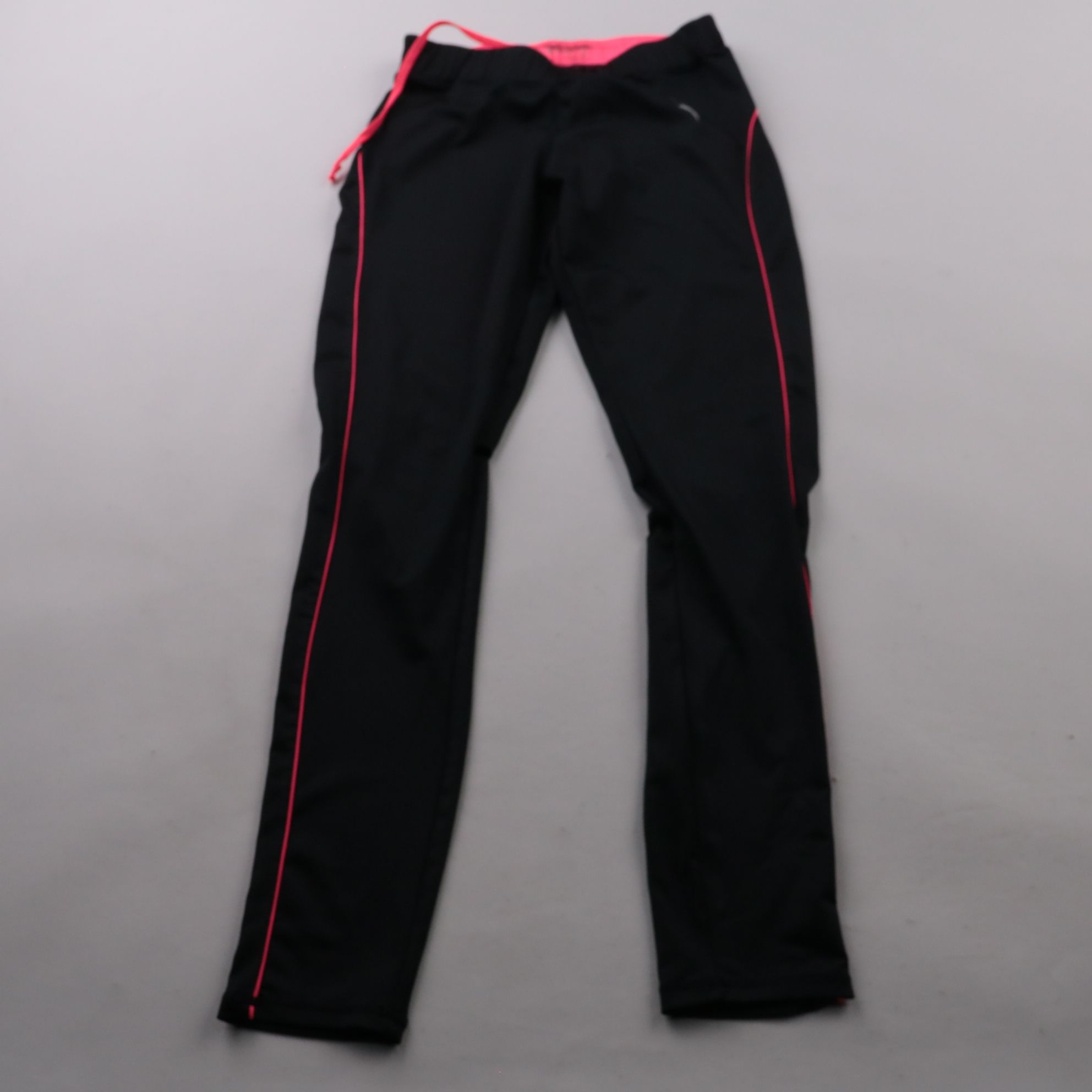 Женские спортивные брюки без указанного бренда, чёрные с розовыми кантами по бокам. Подойдут для тренировок, прогулок и повседневной носки благодаря эластичному материалу. Полиэстер с добавлением эластана хорошо тянется и быстро сохнет.