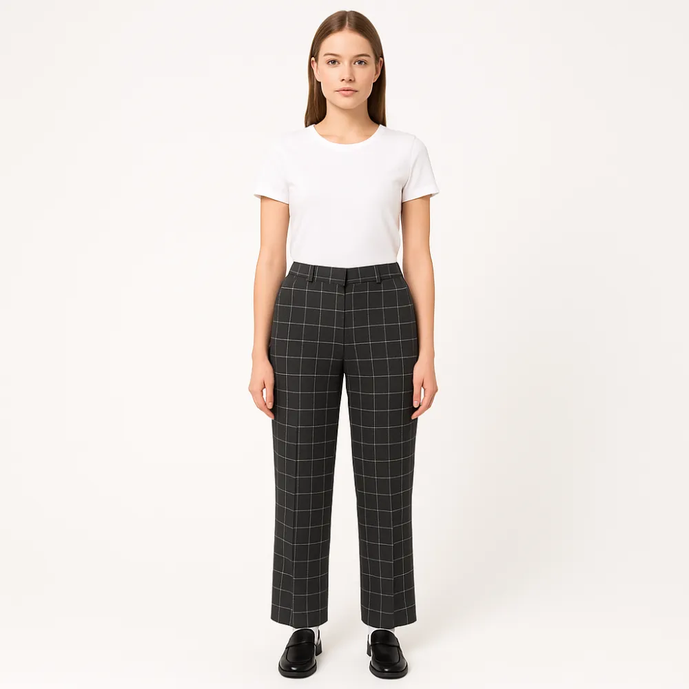 Женские брюки Wonder Woman в серо-чёрную клетку, прямого кроя и средней посадки. Подойдут для офиса и повседневных образов с рубашкой или базовой футболкой. Ткань со стрейчем комфортно сидит и не сковывает движения.