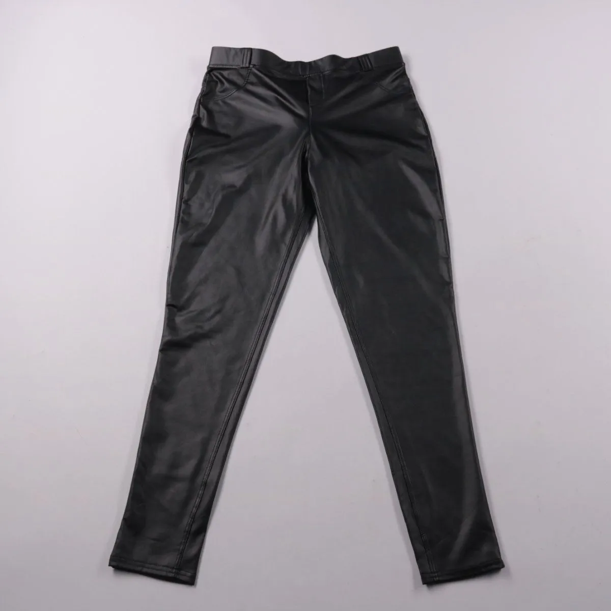Женские облегающие брюки-легинсы из экокожи, бренд не указан. Подойдут для повседневных образов в прохладную погоду и на выход с обувью на каблуке или кроссовками. Практичное преимущество — легко протираются и хорошо тянутся за счёт добавки спандекса.