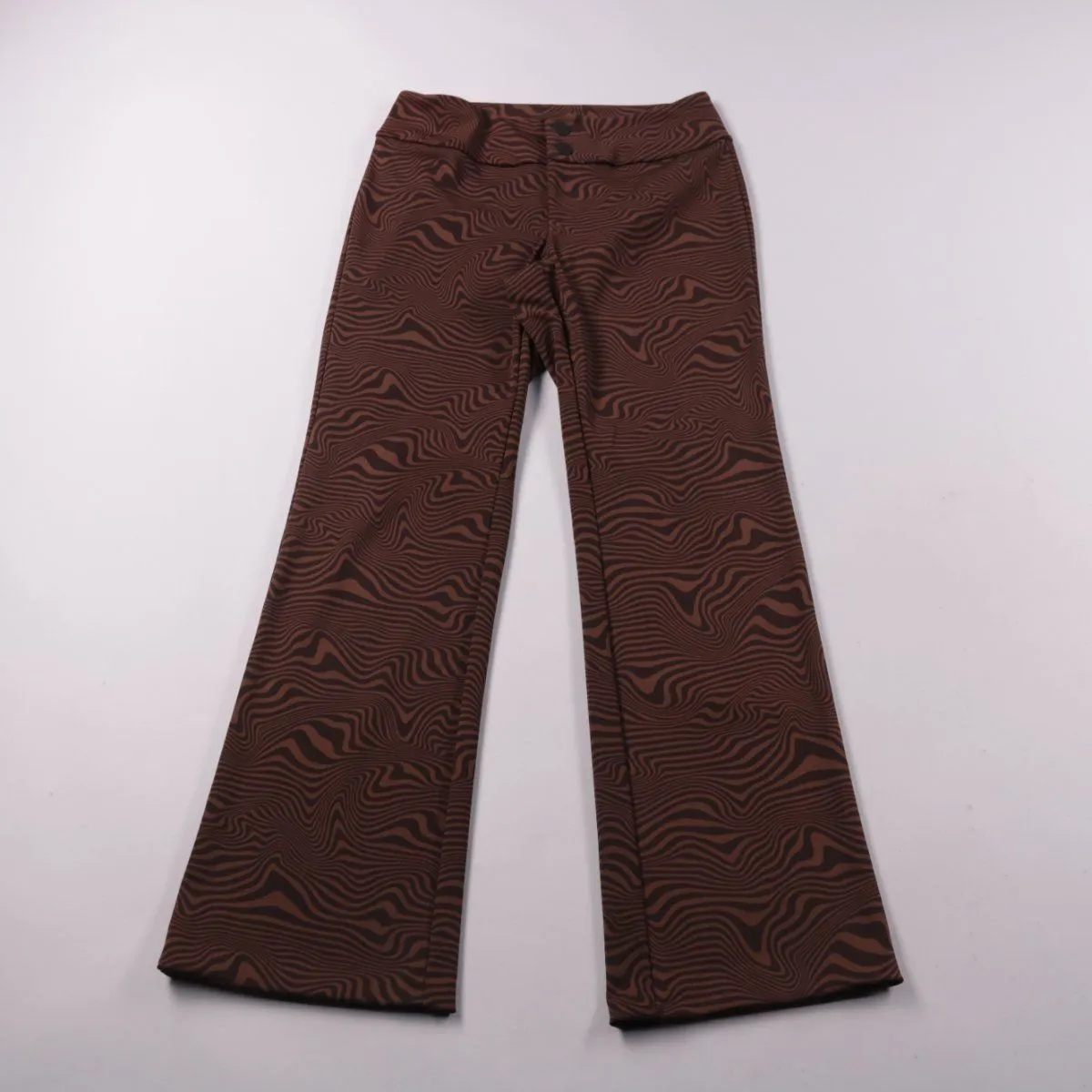 Женские брюки H&M Divided с клёшем и волнистым принтом в коричнево-чёрных тонах. Подойдут для повседневных образов и выходов, легко сочетаются с однотонным верхом. Эластичная ткань хорошо тянется и комфортно сидит по фигуре.
