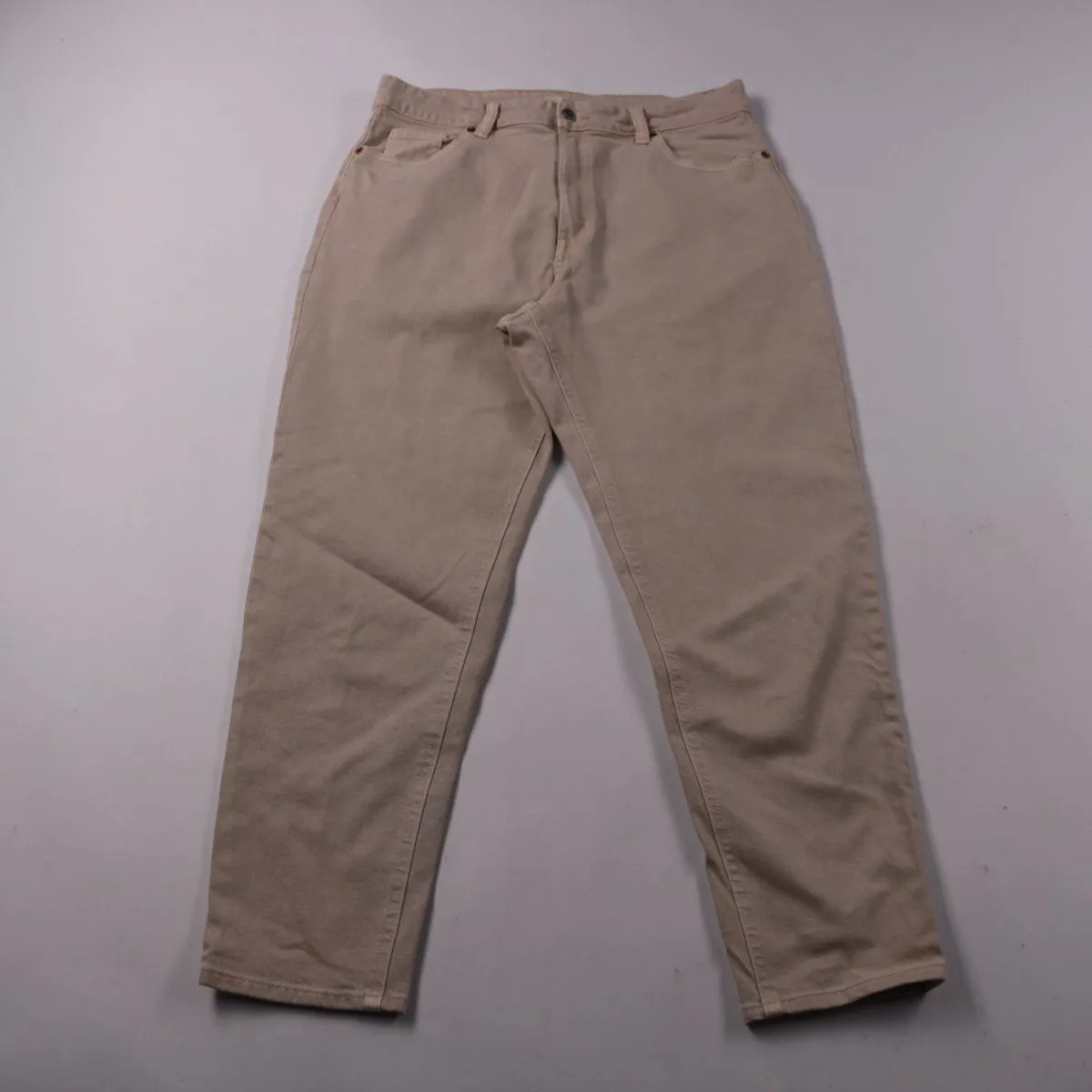 Женские прямые брюки H&M бежевого цвета из плотного хлопка с небольшим добавлением эластана. Подойдут для повседневной носки и офисных образов в стиле casual. Практичный плюс — ткань чуть тянется и комфортно сидит в талии и бёдрах.