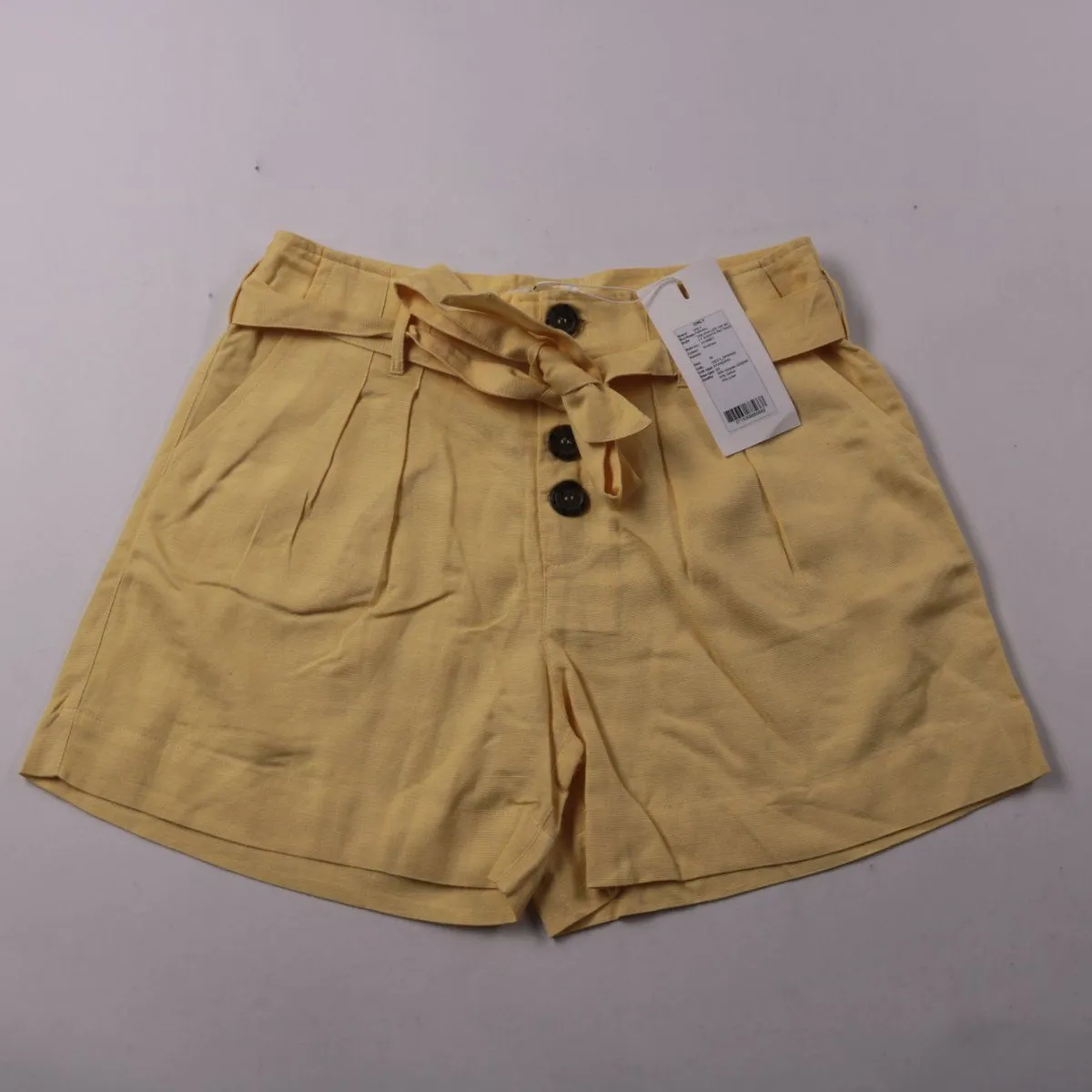 Женские шорты ONLY светло‑жёлтого цвета с высокой посадкой, пуговицами спереди и поясом-завязкой. Подойдут для летних прогулок и отпуска, легко сочетаются с базовыми топами и рубашками. Натуральные добавки в составе делают ткань более дышащей.