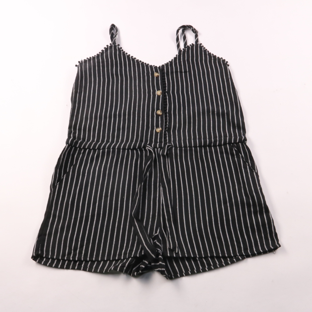 Летний комбинезон Jubylee из хлопка, чёрный в белую полоску, на тонких бретелях и с пуговицами спереди. Подойдёт для прогулок и отдыха в жаркую погоду, талию можно подчеркнуть поясом-завязкой. Хлопковая ткань дышит и комфортна в носке.