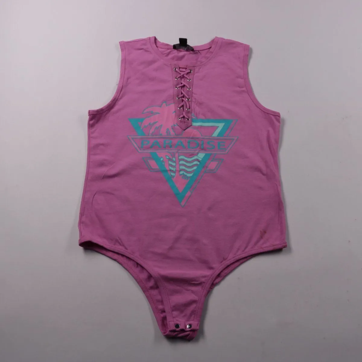 Женское боди Atmosphere розового цвета с принтом и шнуровкой на груди. Подойдёт для летних образов с джинсами или юбкой, а также как базовый слой под жакет. Снизу застёгивается на кнопки, поэтому удобно сидит и не выбивается из одежды.