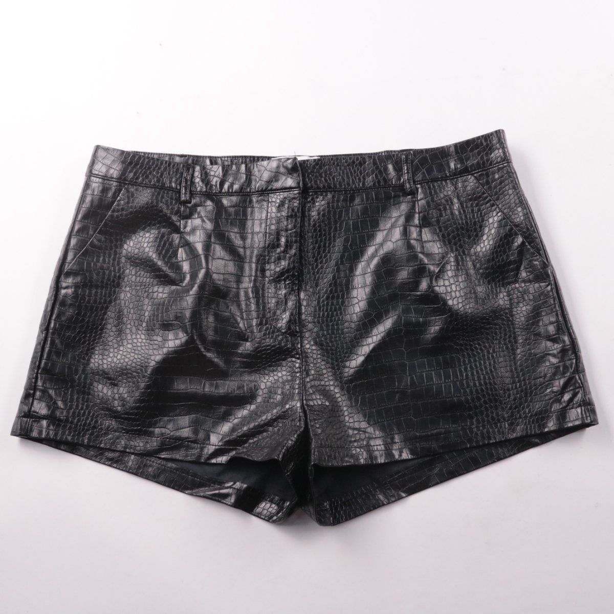 Женские шорты Rita Ora x Primark из материала под кожу с тиснением под крокодила, цвет чёрный. Подойдут для повседневных и вечерних образов в прохладную погоду, хорошо сочетаются с плотными колготками и ботинками. Практичное преимущество — легко протираются и держат форму.