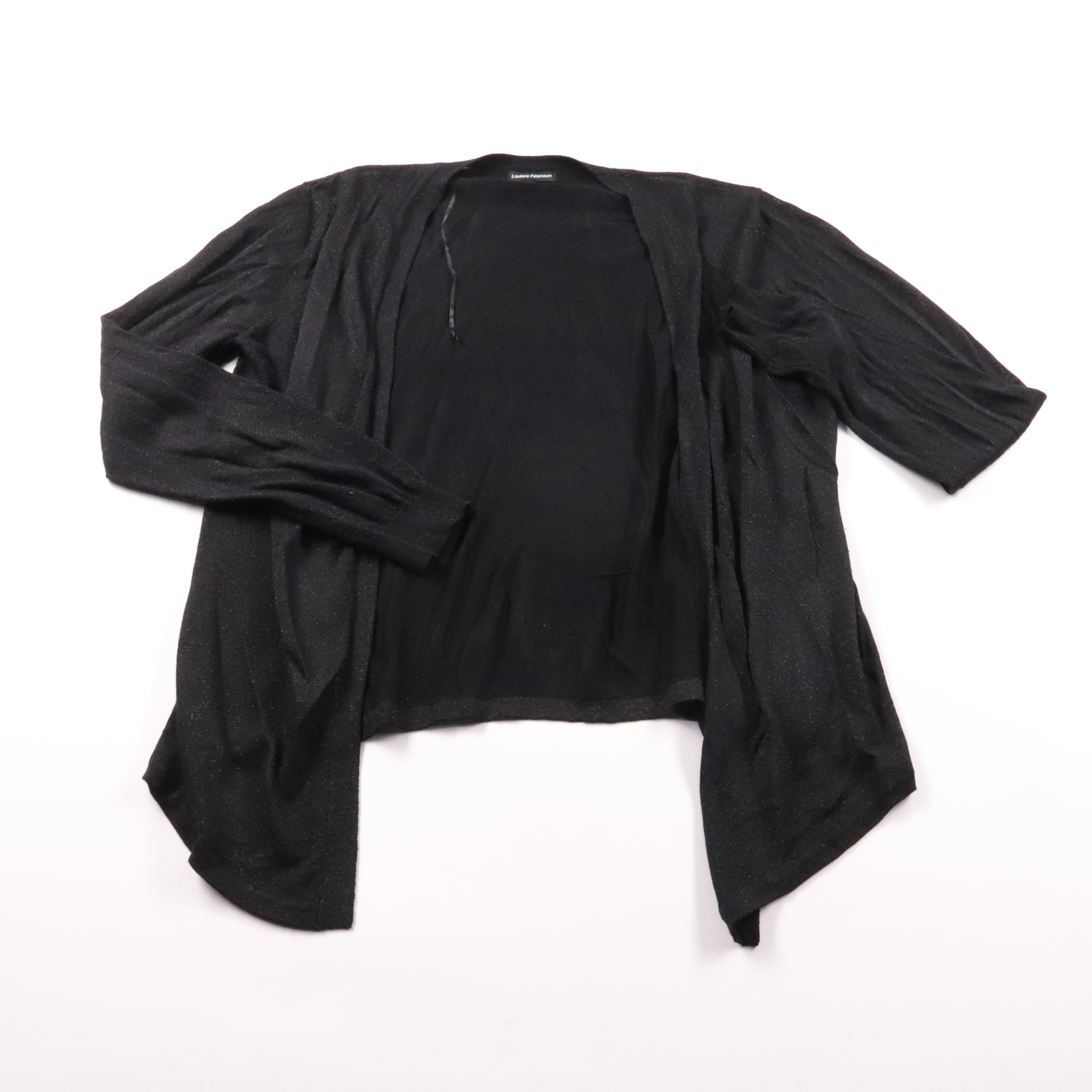 Женский кардиган Ladies Fashion чёрного цвета с лёгким блеском и открытым передом. Подойдёт для офиса и повседневных образов как накида на топ или платье. Мягкий трикотаж хорошо драпируется и не сковывает движения.