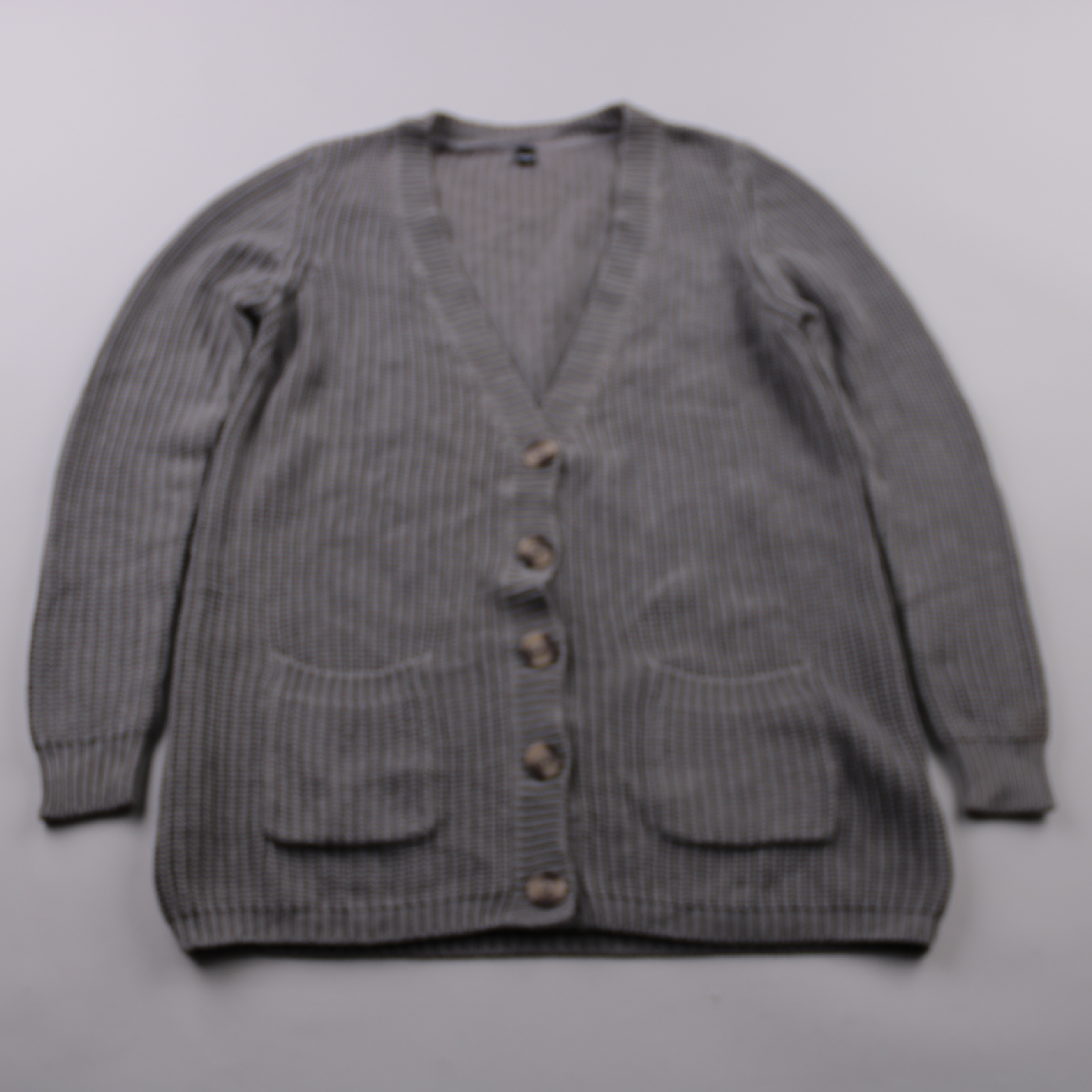 Серый вязаный кардиган Pimkie в рубчик на пуговицах, с V-образным вырезом и накладными карманами. Подойдёт для офиса и повседневных образов в прохладную погоду, удобно носить поверх топа или водолазки. Плотная вязка хорошо держит форму и добавляет тепл...