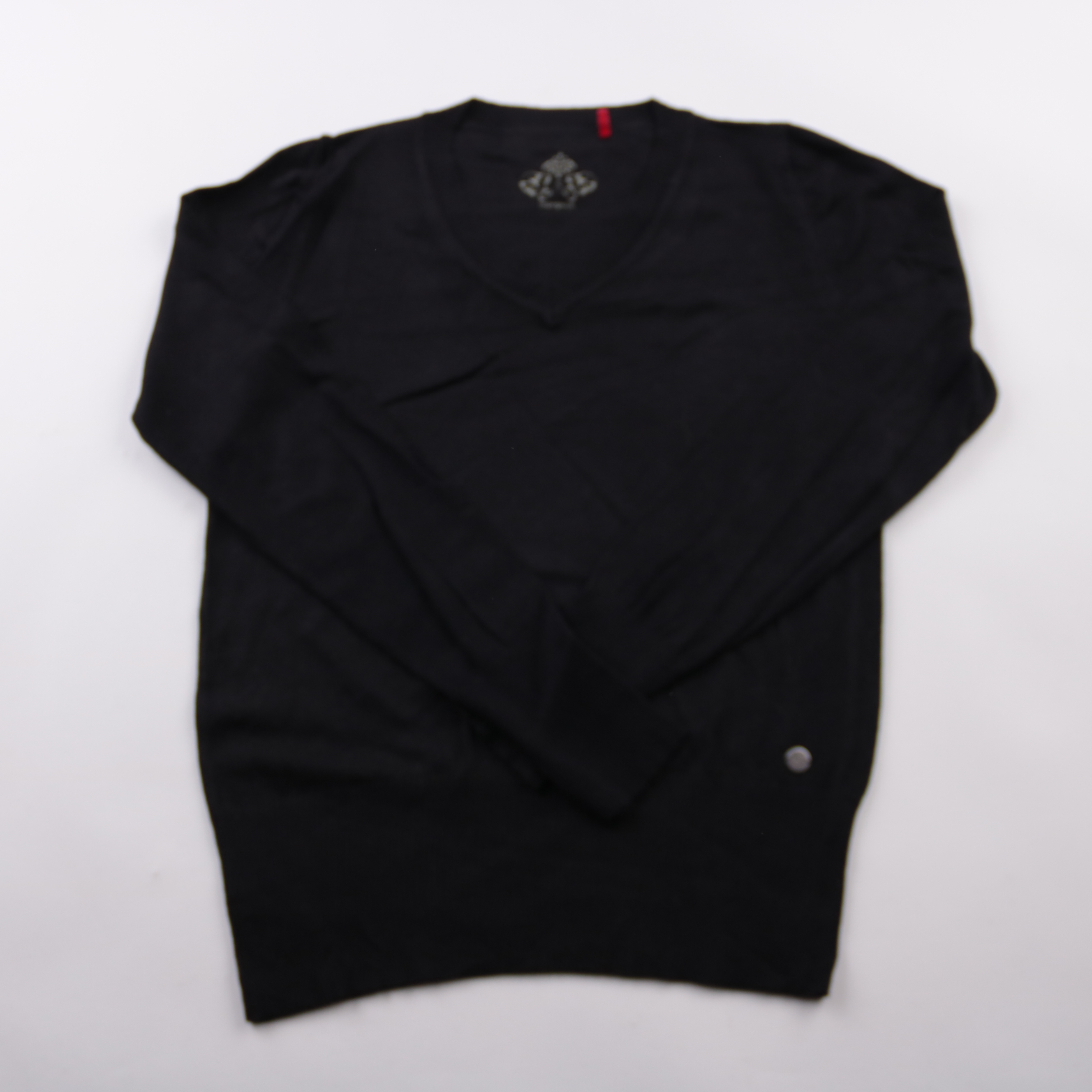Чёрный джемпер Manguun с V-образным вырезом и мягкой трикотажной фактурой. Подойдёт для офиса и на каждый день, легко сочетается с джинсами или юбкой. Практичный в уходе и удобно носится благодаря добавлению полиамида в составе.