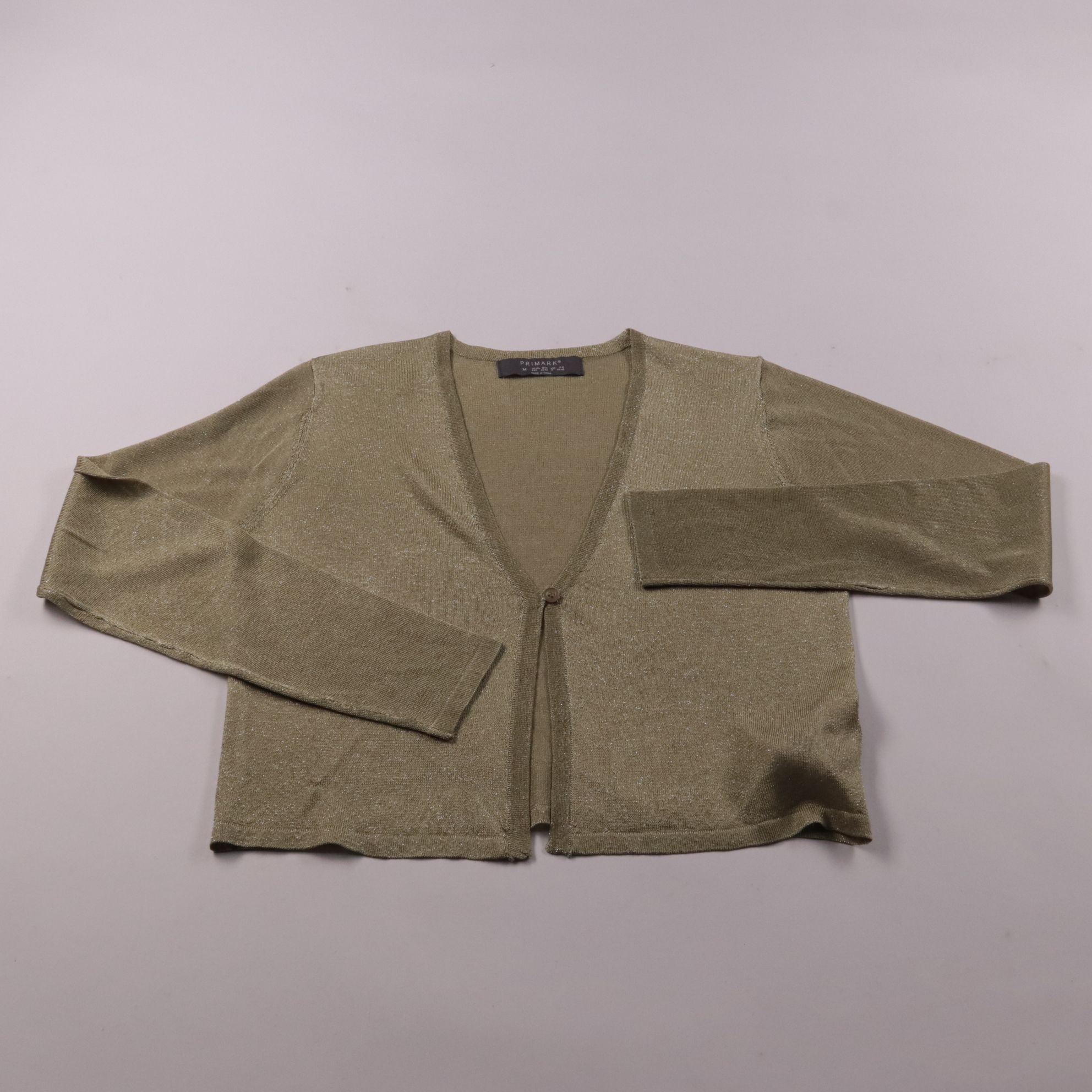 Лёгкий кардиган Primark с V‑образным вырезом и тонким люрексом, застёгивается на одну пуговицу. Подойдёт для офиса и вечерних выходов, хорошо смотрится поверх топа или платья. Ткань тонкая и не занимает много места, удобно брать с собой как накидку.