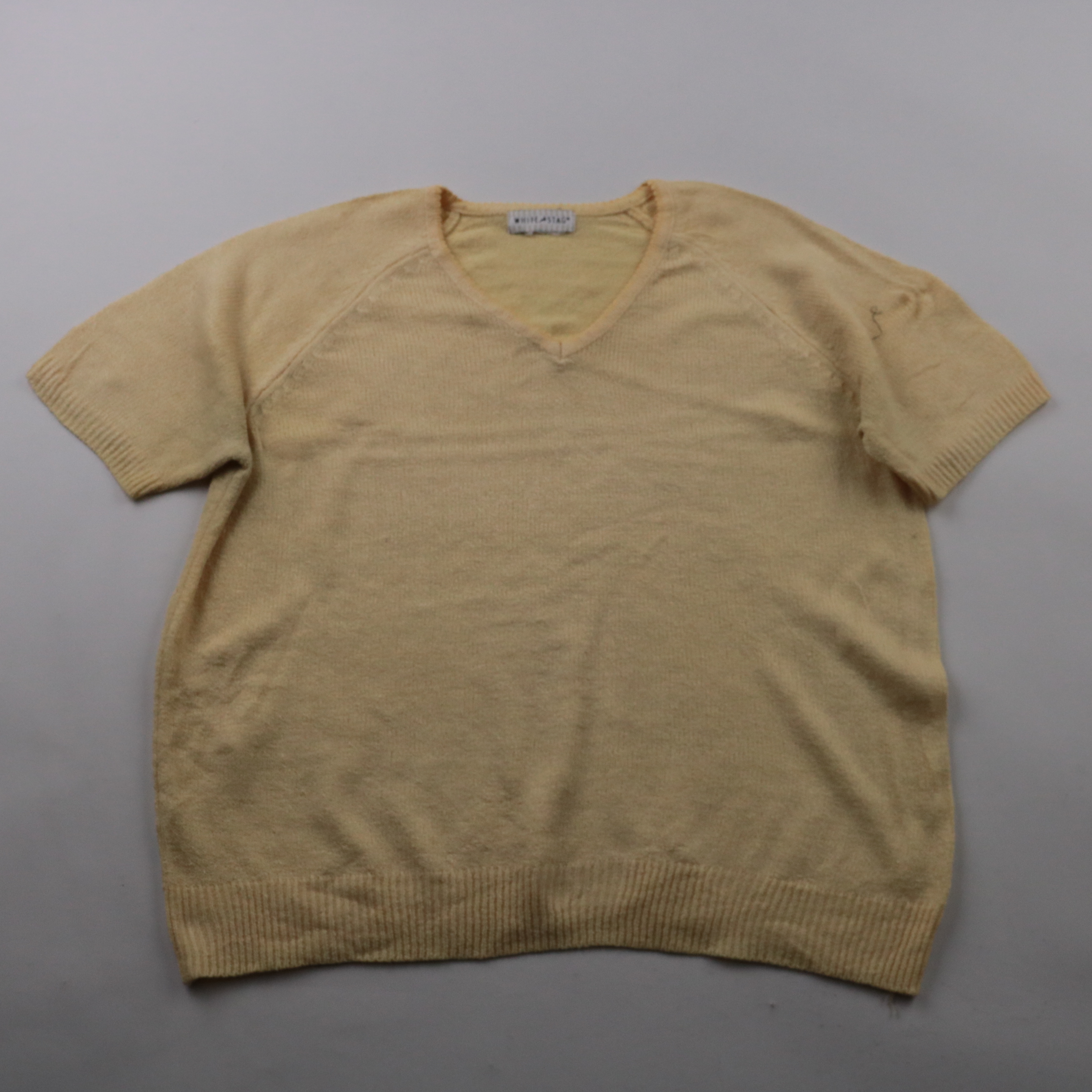 Трикотажный джемпер White Stag светло-жёлтого цвета с V‑вырезом и коротким рукавом. Подойдёт для повседневных образов и офиса, удобно носить как самостоятельно, так и под жакет. Лёгкий и компактный, не занимает много места в сумке или чемодане.