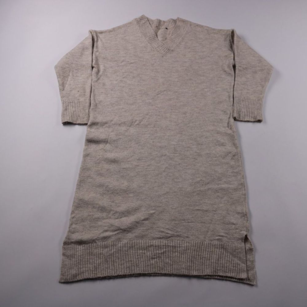 Вязаная кофта-туника с V-образным вырезом в спокойном бежево-сером оттенке, бренд не указан. Подойдёт для повседневной носки и многослойных образов в прохладную погоду. Удлинённый крой удобен тем, что хорошо сочетается с леггинсами и узкими джинсами.