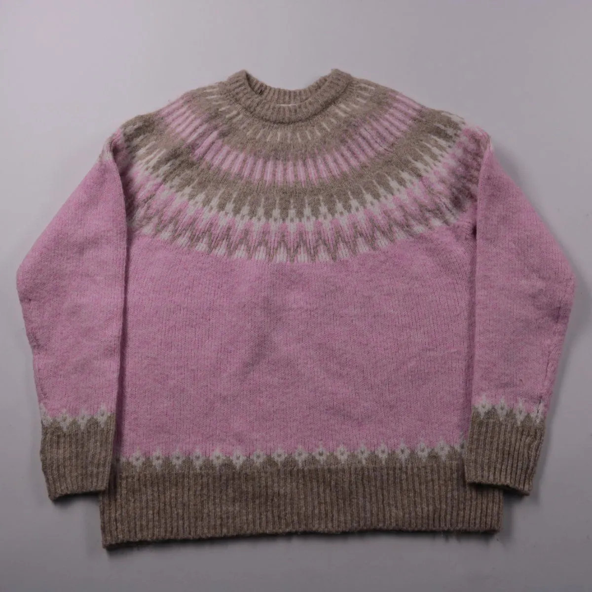 Свитер Primark с жаккардовым узором на кокетке и по низу, в розово-бежевой гамме. Подойдёт для повседневных зимних образов и тёплых прогулок. Мягкий вязаный материал хорошо согревает и не требует сложного ухода.
