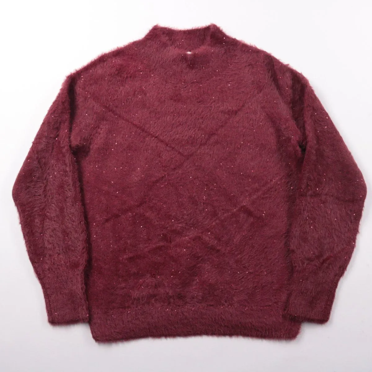 Пушистый свитер Tu бордового цвета с легким блеском и фактурным узором спереди. Подойдет для повседневных образов в прохладную погоду, хорошо сочетается с джинсами и юбками. Мягкий материал приятен к телу и сохраняет тепло.