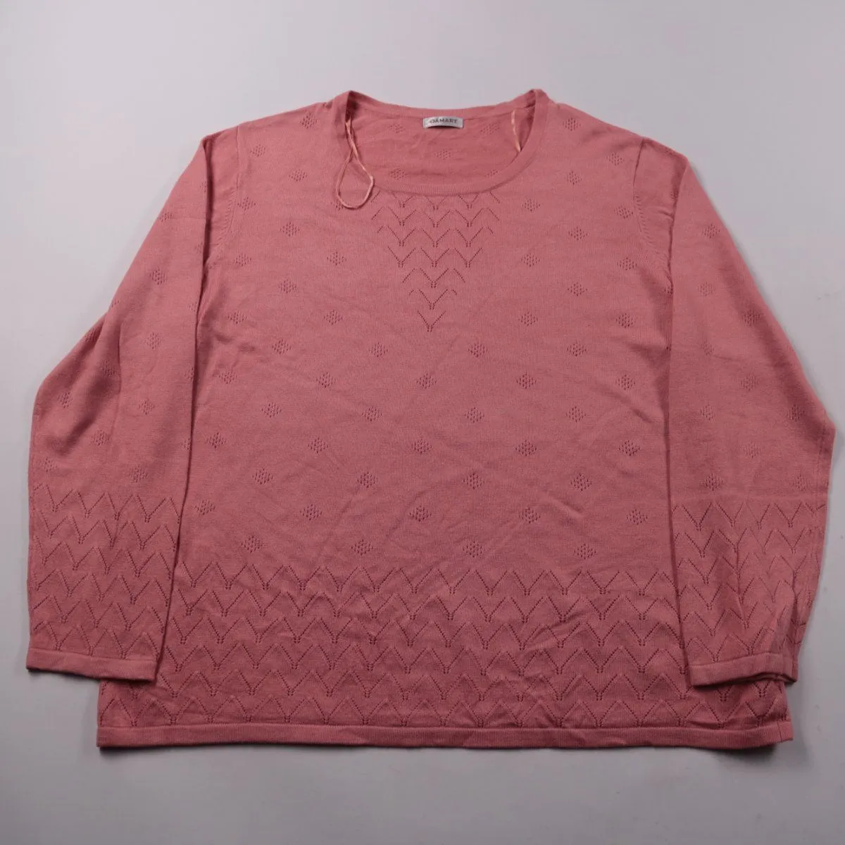 Женский джемпер Damart розового цвета с круглым вырезом и ажурным узором по низу и на рукавах. Подойдёт для повседневных образов и офиса в прохладную погоду. Смесовый состав с вискозой хорошо дышит и приятен к телу.