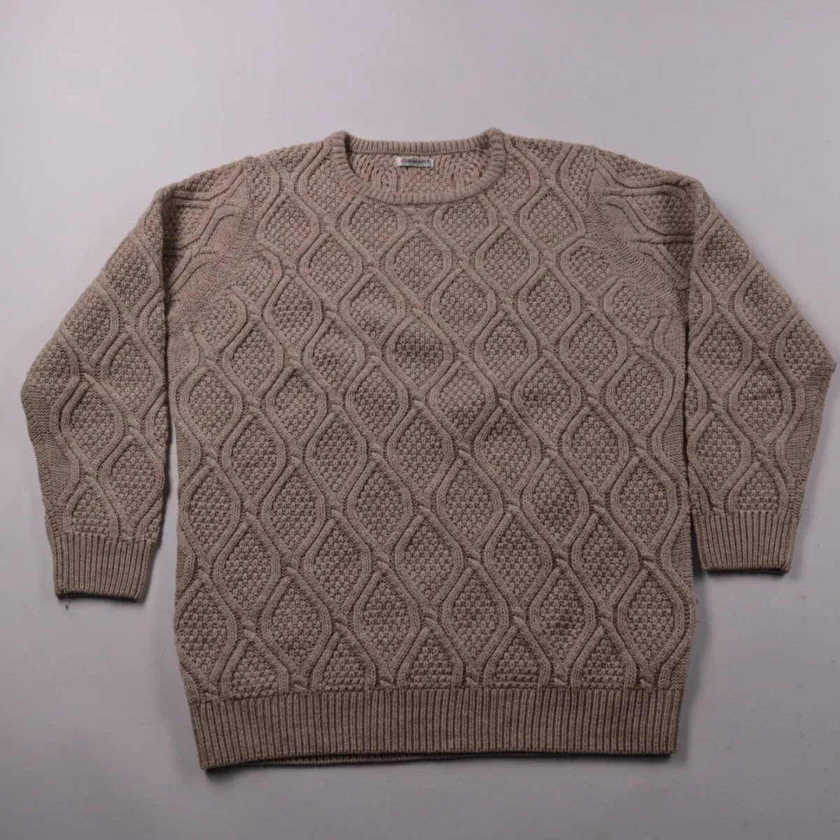 Вязаный свитер Damart бежевого оттенка с фактурным рельефным узором и круглым вырезом. Подойдёт для повседневных образов в прохладную погоду, хорошо смотрится с джинсами и брюками. Смесь акрила с шерстью даёт тепло и делает изделие менее требовательным в уходе.