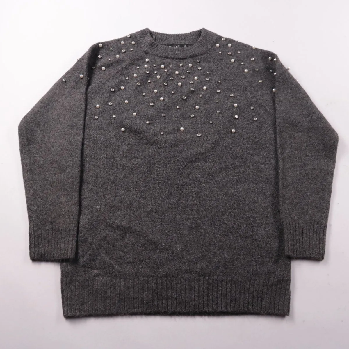 Женский свитер F&F серого цвета с декором из бусин/стразы на плечах и по верху переда. Подойдёт для повседневных образов в прохладную погоду и для офиса. Мягкая трикотажная вязка и эластичные манжеты/низ помогают свитеру комфортно сидеть и держать форму.