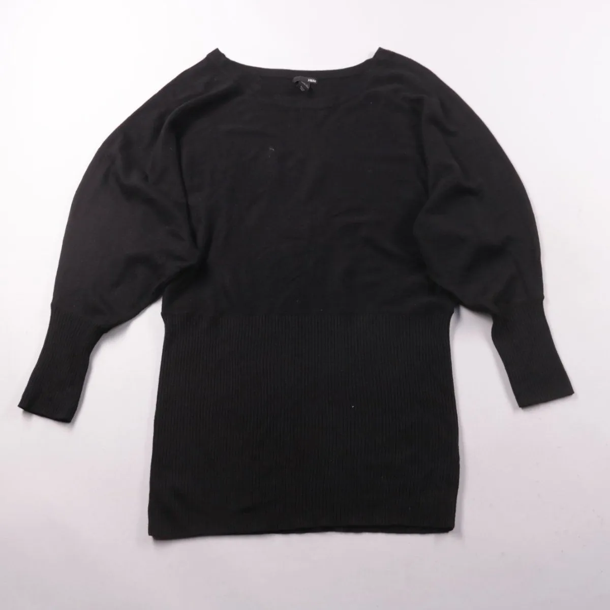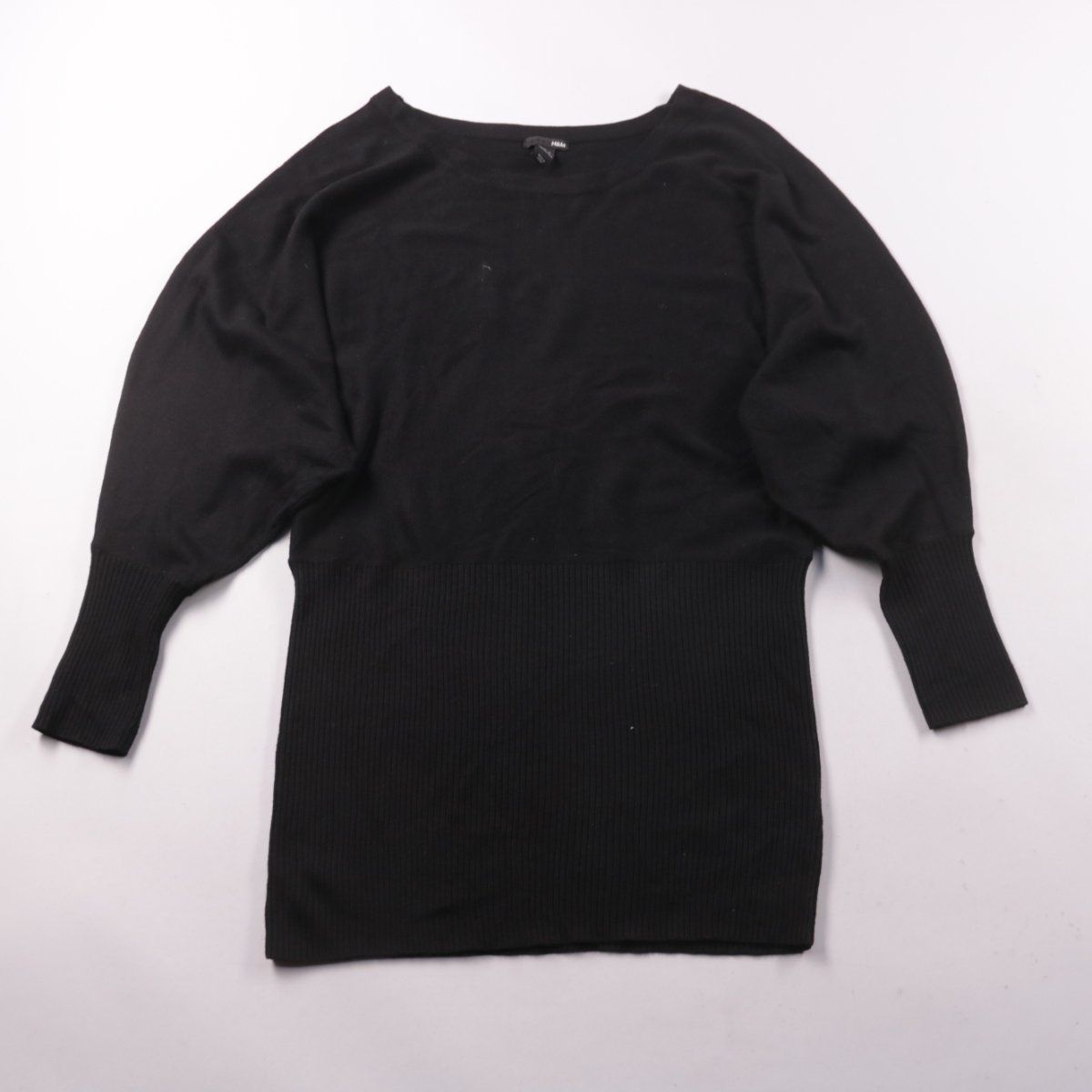 Чёрный трикотажный джемпер без заметного декора, с мягкой линией плеч и широкими манжетами/нижней резинкой. Подойдёт для повседневных образов и офиса, хорошо сочетается с джинсами и юбками. Практичный плюс — базовый цвет и комфортная посадка.