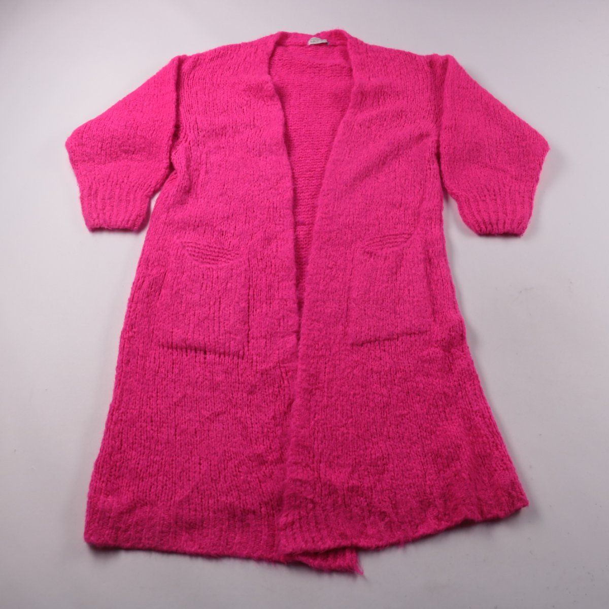 Удлинённый вязаный кардиган без застёжки, Made in Italy, ярко-розового (фуксия) цвета. Подойдёт для прохладной погоды и многослойных образов, есть накладные карманы. Мягкая фактурная вязка хорошо сохраняет тепло и комфортна в носке.