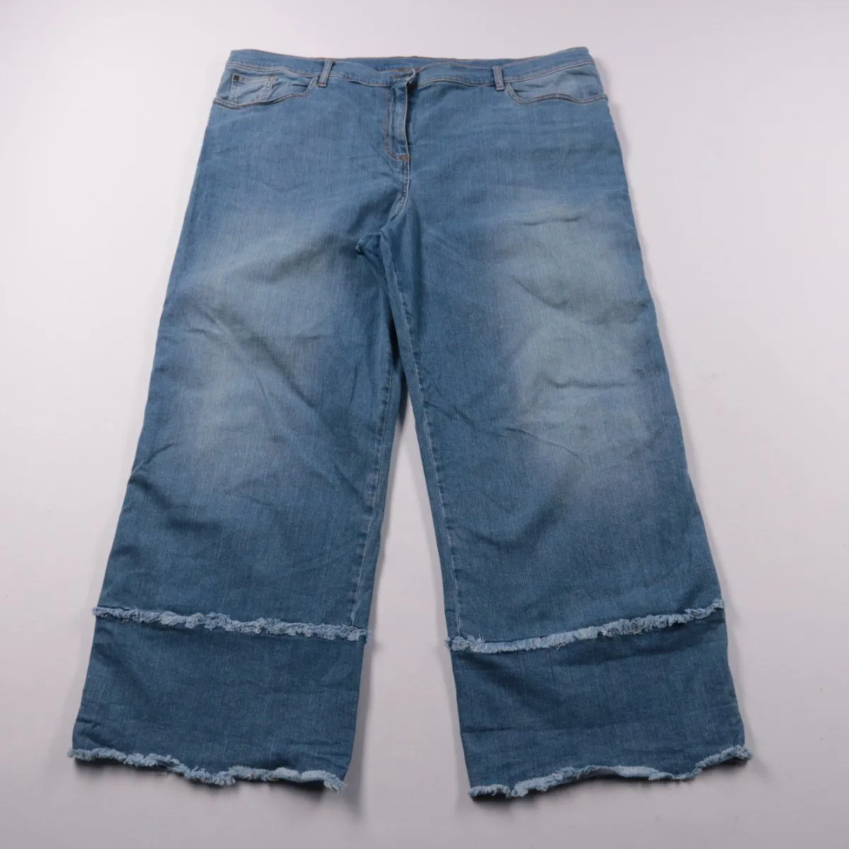 Женские джинсы из денима голубого цвета с широкими укороченными штанинами и необработанным краем. Подойдут для повседневных образов в тёплое время года и в межсезонье, хорошо смотрятся с кедами и ботинками. Плотная ткань со стрейчем комфортно садится по фигуре и не сковывает движения.