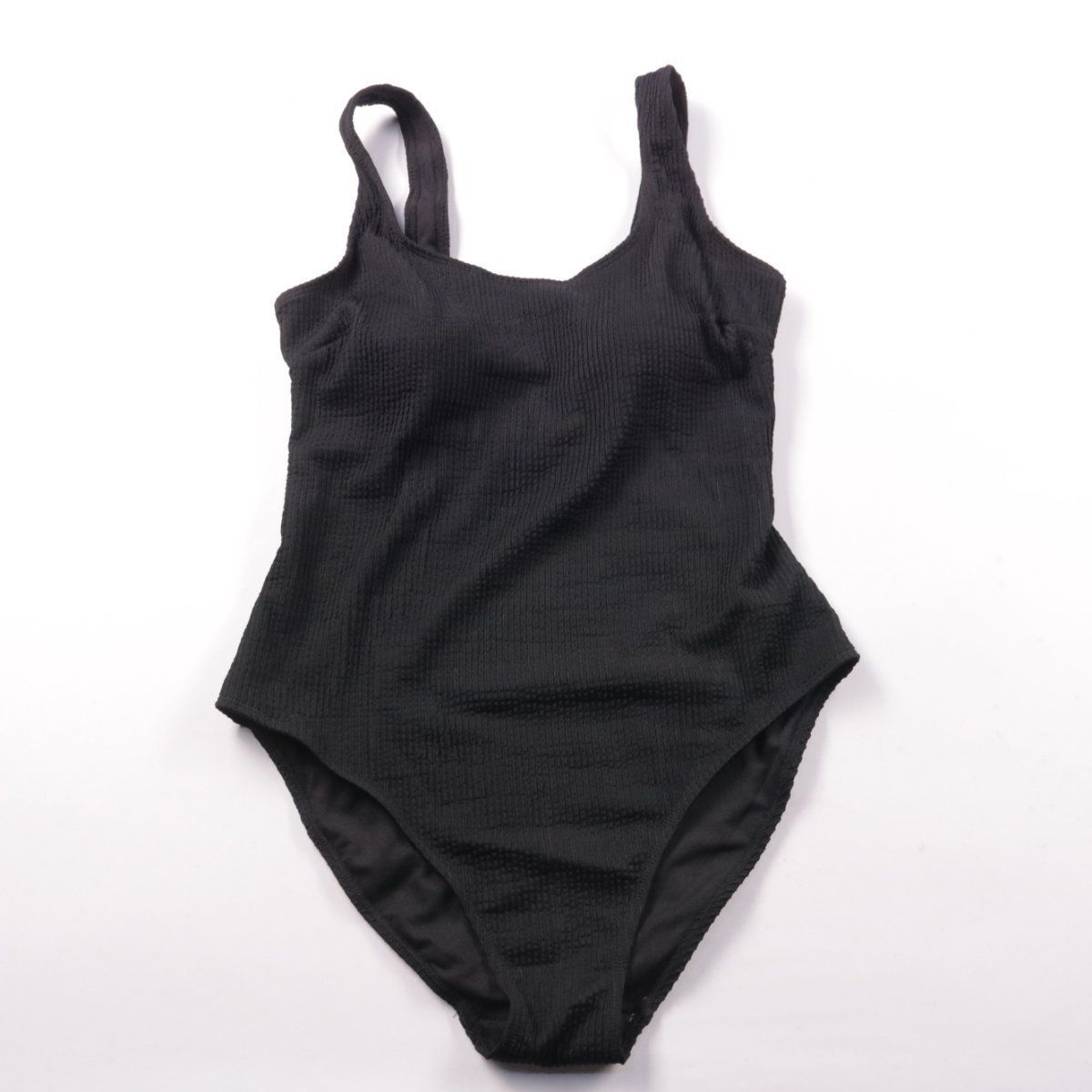 Слитный купальник George чёрного цвета с широкими бретелями и фактурной тканью. Подойдёт для бассейна и пляжа, хорошо сидит по фигуре. Подкладка делает изделие более комфортным при носке.