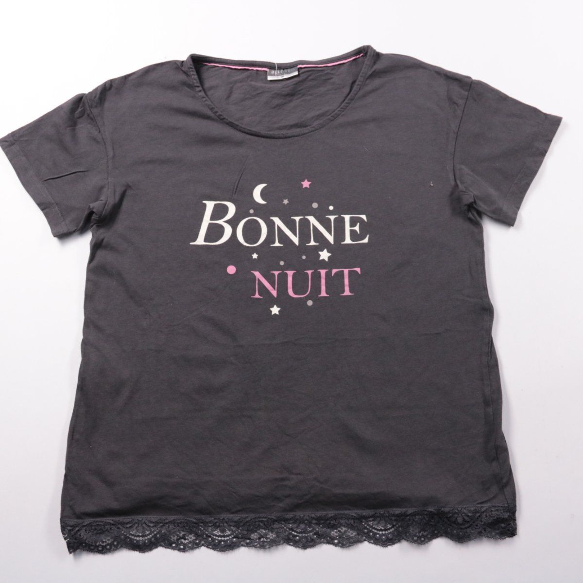Женская футболка для сна Beloved Nightwear из хлопка, с принтом «Bonne Nuit» и кружевной отделкой по низу. Подойдёт для дома и как пижамный верх в тёплое время года. Мягкая ткань приятна к телу и хорошо дышит.