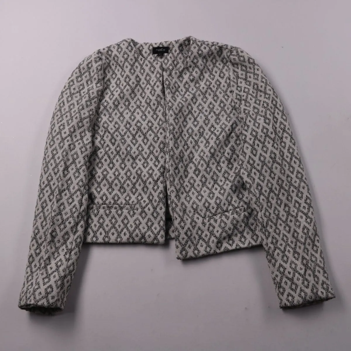 Короткий жакет Next с геометрическим чёрно-белым принтом и накладными карманами. Подойдёт для офиса и повседневных образов в прохладную погоду. Лёгкий полиэстер быстро сохнет и прост в уходе.