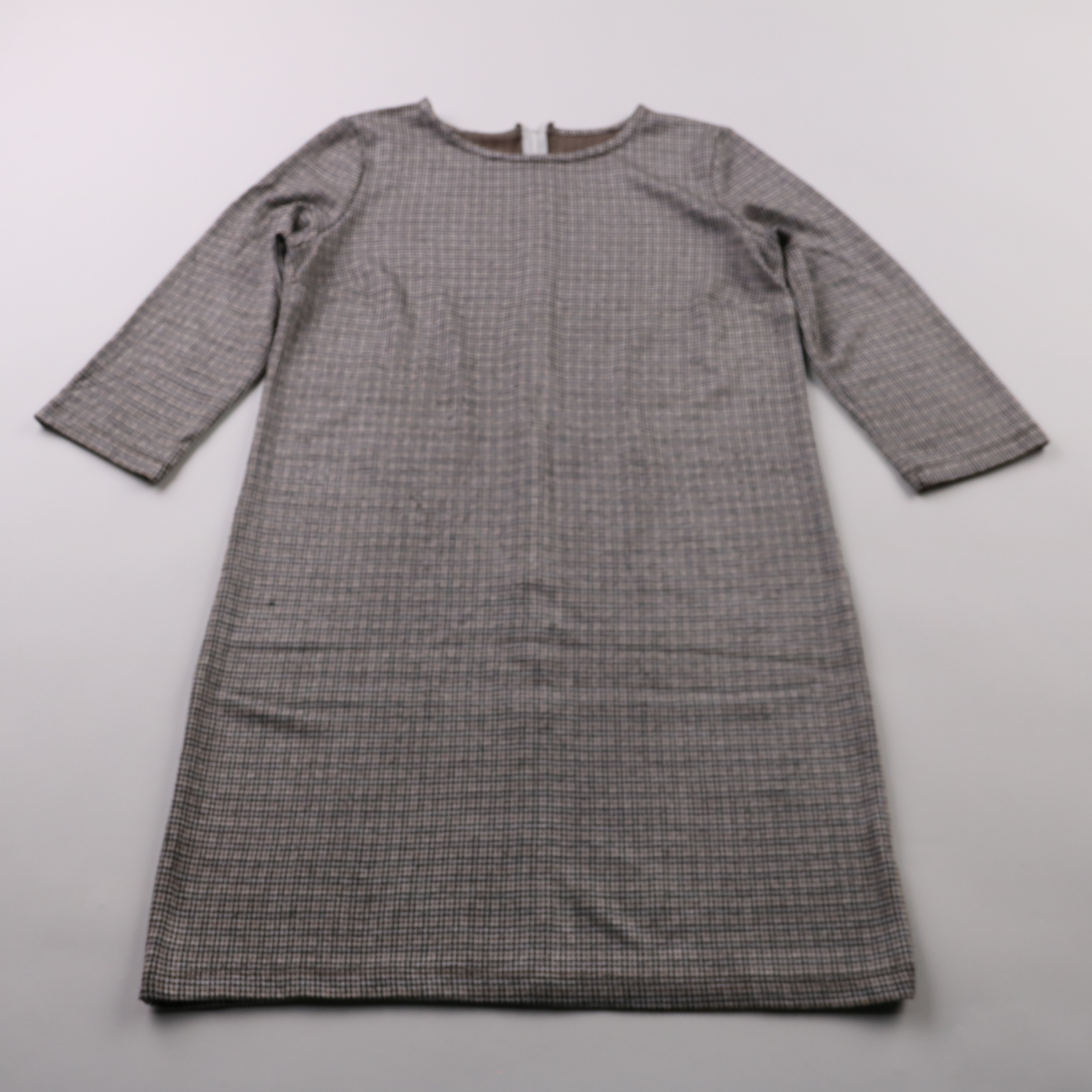 Женское платье прямого кроя с рукавом 3/4, в мелкую клетку/«гусиную лапку». Подойдёт для офиса и повседневных образов в демисезон. Практичный плюс — немаркий серо-коричневый оттенок и лаконичный фасон, который легко сочетать с обувью и жакетом.