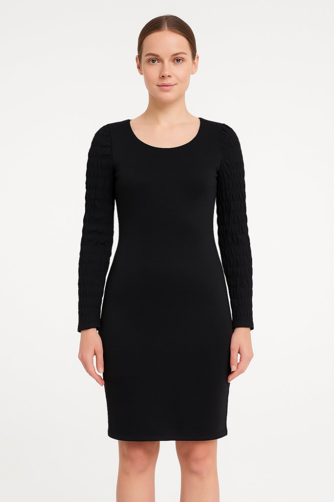 Черное облегающее платье Multiblue длины до колена с круглым вырезом и длинными рукавами с фактурной сборкой. Подойдет для офиса и повседневных выходов, легко сочетается с пиджаком, кардиганом и обувью на каблуке или с кедами. Практичное: немаркий цвет...