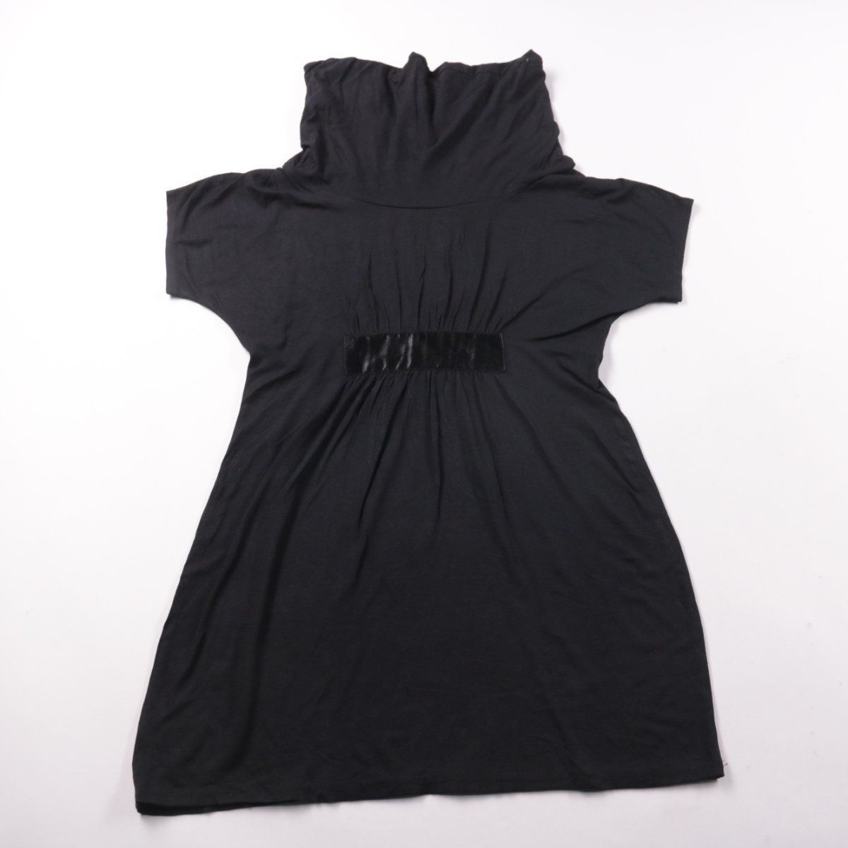 Чёрное повседневное платье s.ti с высоким воротником и коротким рукавом, с акцентом на талии за счёт эластичной вставки. Подойдёт для повседневной носки и офиса, удобно комбинируется с жакетом или кардиганом. Практичный плюс — мягкая тянущаяся ткань, не сковывает движения.
