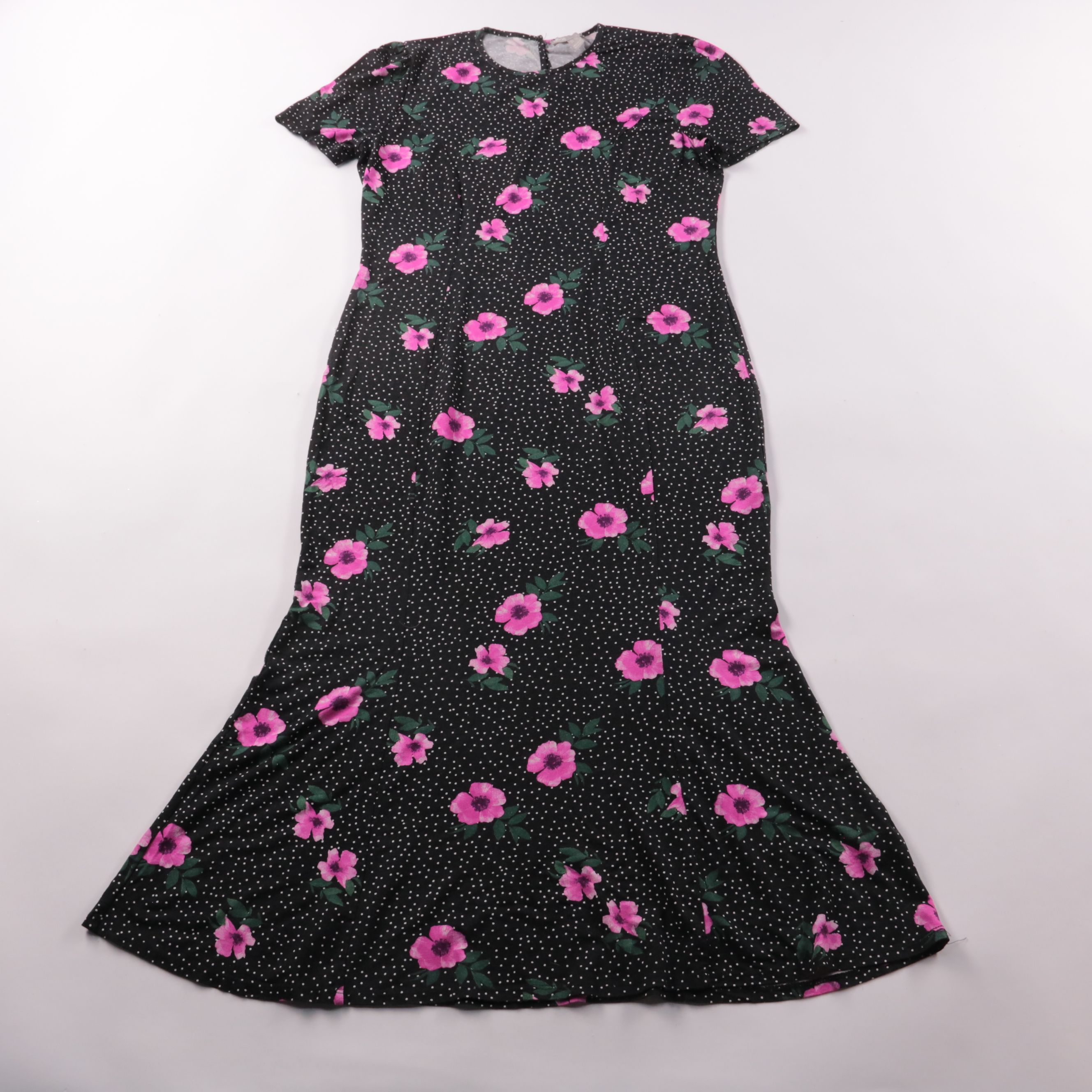 Повседневное платье ASOS длины миди/макси с коротким рукавом и приталенным силуэтом. Чёрная основа в мелкий белый горох с розовыми цветами подойдёт для прогулок и летних выходов. Вискоза с добавлением эластана мягкая и немного тянется, поэтому платье к...