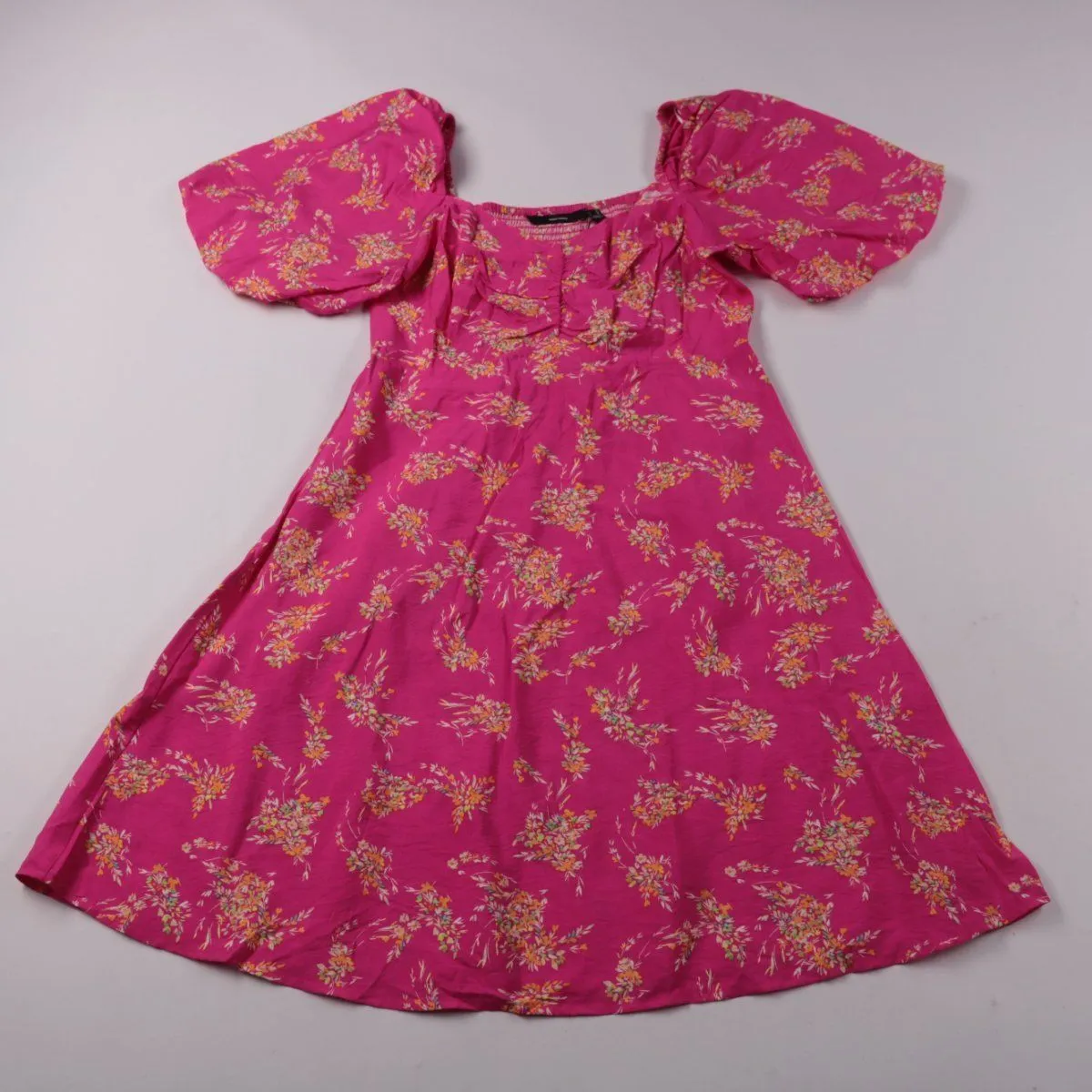 Повседневное платье Vero Moda ярко-розового цвета с мелким цветочным принтом, короткими рукавами-фонариками и квадратным вырезом. Подойдёт для прогулок и летних встреч, свободная юбка комфортно сидит и не сковывает движения. Ткань из вискозы лёгкая и хорошо дышит в тёплую погоду.