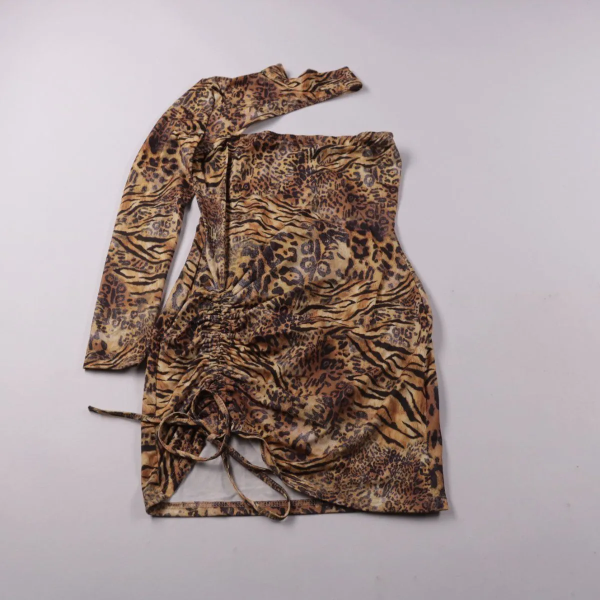 Женское повседневное платье SHEIN с анималистичным принтом и асимметричным кроем на одно плечо. Модель облегающая, со сборкой и кулиской сбоку — удобно регулировать длину и посадку. Подойдёт для выхода в город и вечеринок, а эластичная ткань комфортно тянется.