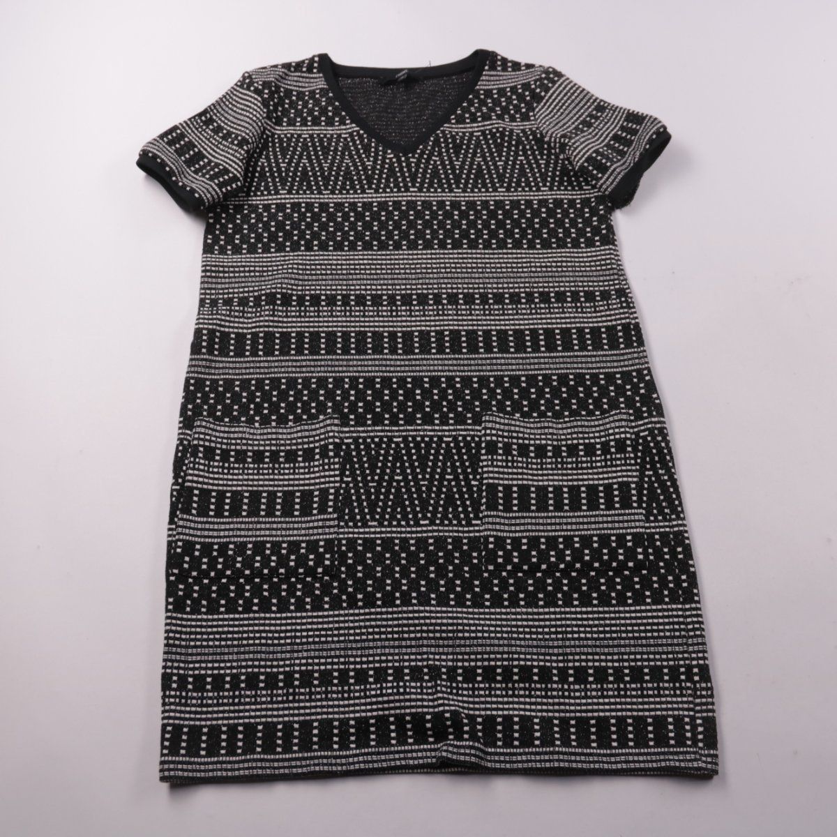 Повседневное платье Next из трикотажа с геометрическим узором, V-образным вырезом и коротким рукавом. Подойдёт для офиса и на каждый день, хорошо смотрится с плотными колготками и ботильонами. Материал эластичный, поэтому изделие комфортно сидит и не сковывает движения.
