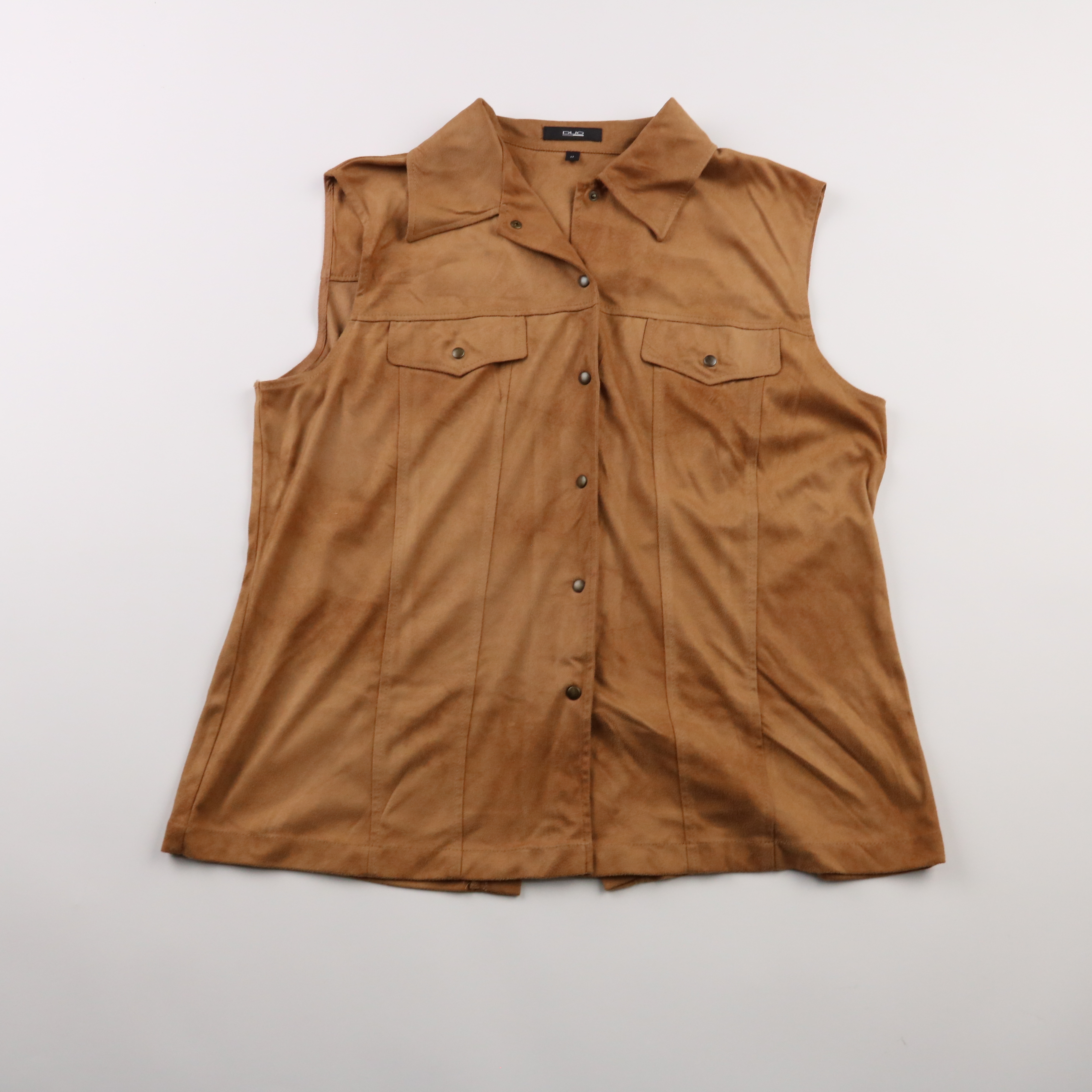 Блузка Duo без рукавов из мягкого материала под замшу, коричневого цвета, с отложным воротником и застёжкой на кнопки. Подойдёт для повседневных образов и офиса, хорошо сочетается с джинсами или брюками. Практичный плюс — ткань выглядит эффектно и почт...