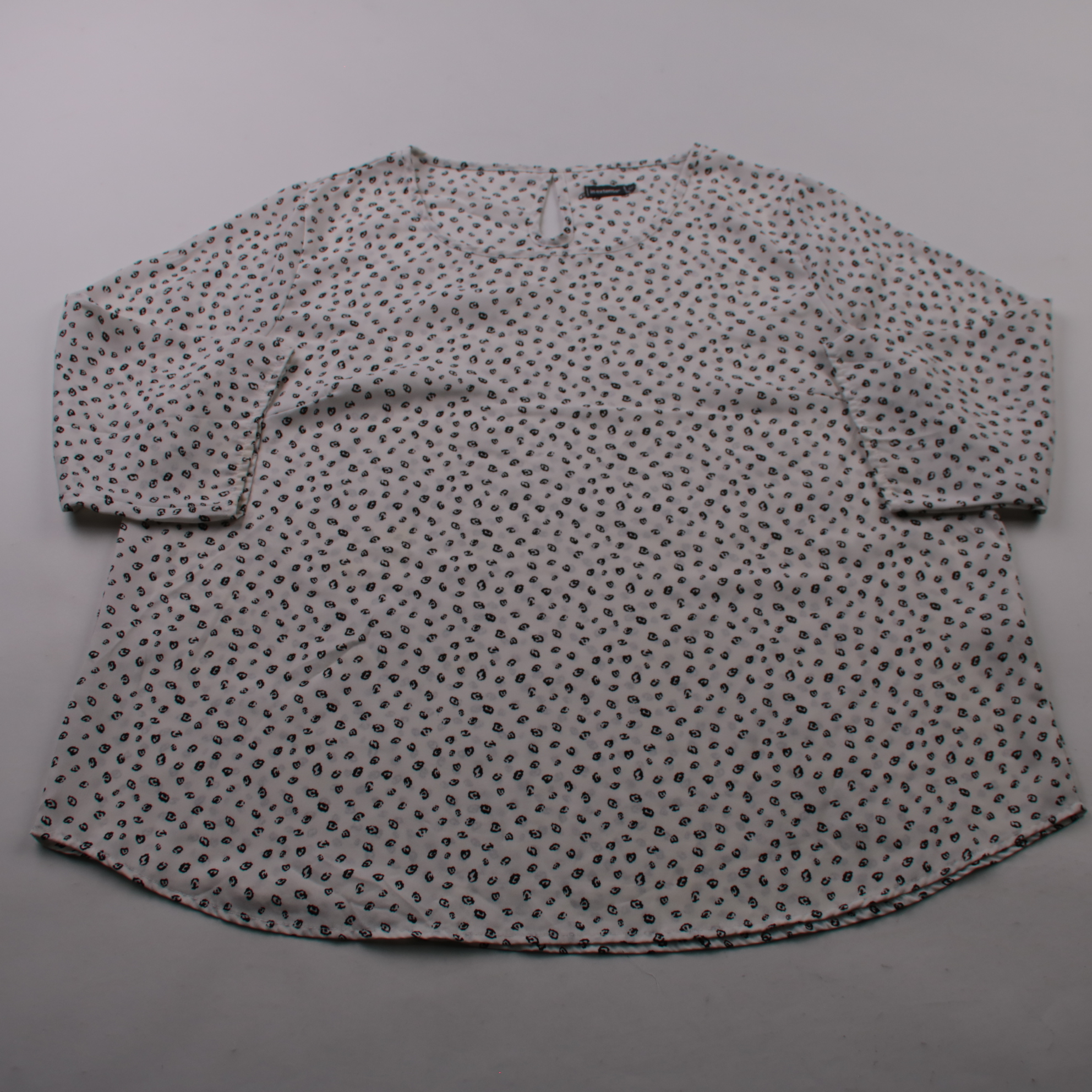 Блузка In Extenso белого цвета с мелким чёрным принтом и коротким рукавом. Подойдёт для офиса и повседневных образов с брюками или юбкой. Лёгкая ткань 100% полиэстер, быстро сохнет и почти не мнётся.