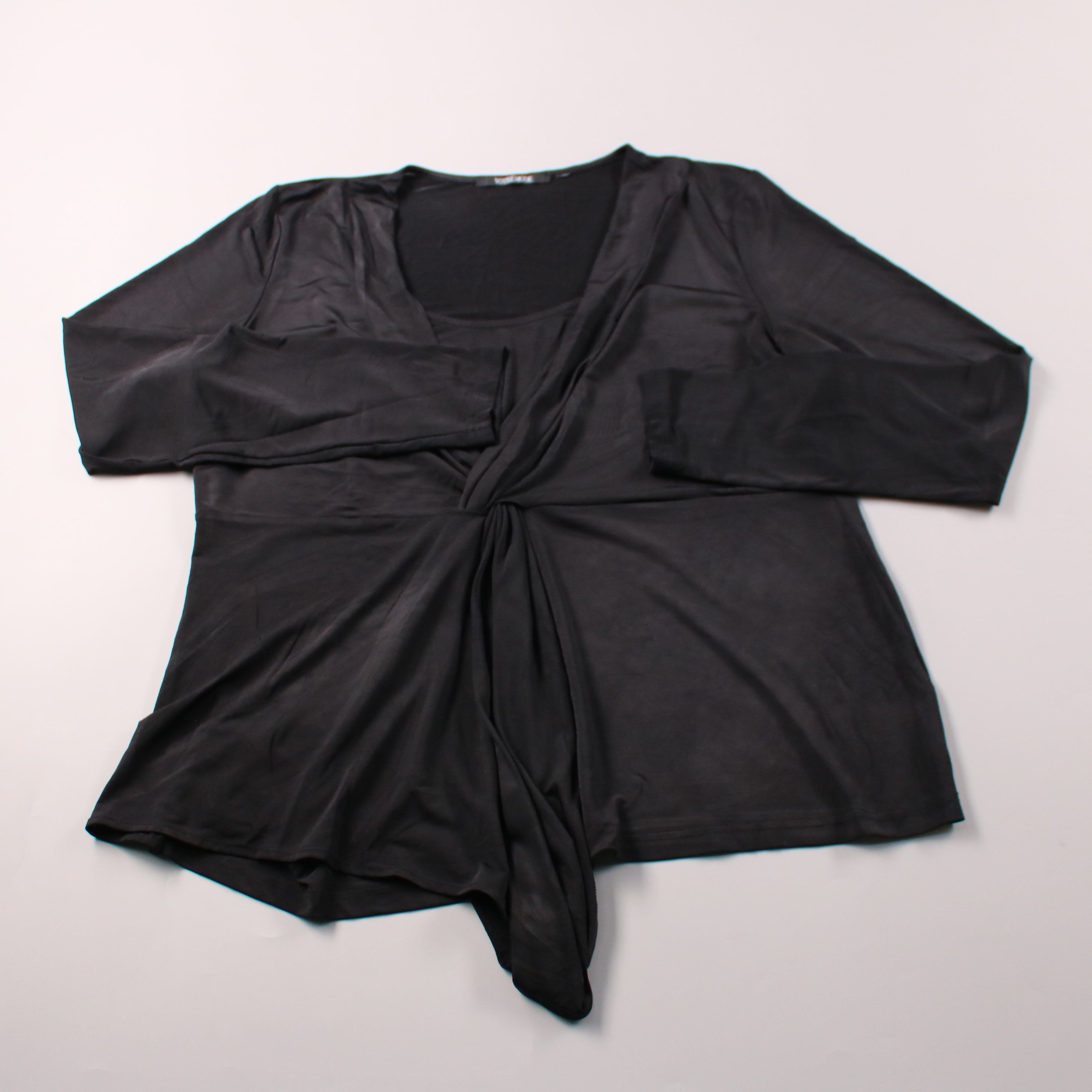Женская блузка Votre Mode чёрного цвета с V-образным вырезом и драпировкой/узлом спереди. Подойдёт для офиса и на вечер — легко сочетается с брюками или юбкой. Практичная ткань почти не мнётся и выглядит аккуратно в течение дня.