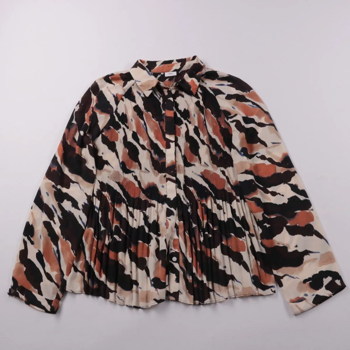 Блузка S.Oliver с длинным рукавом и абстрактным принтом в чёрно-бежево-коричневых тонах, фактура ткани — мелкая плиссировка. Подойдёт для офиса и повседневных образов, хорошо сочетается с однотонными брюками или юбкой. Практичный плюс — полиэстер почти не мнётся и быстро сохнет.