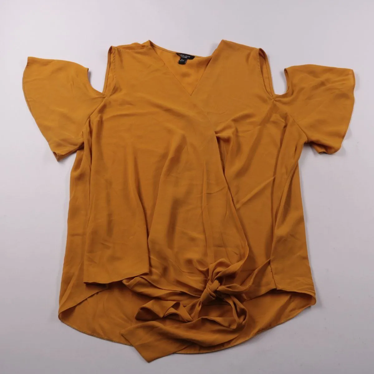 Женская блузка New Look Curves горчичного оттенка с V-вырезом и открытыми плечами (cold shoulder). Подойдёт для повседневных летних образов и офиса в жаркую погоду, хорошо сочетается с джинсами и юбками. Лёгкий полиэстер почти не мнётся и быстро сохнет после стирки.