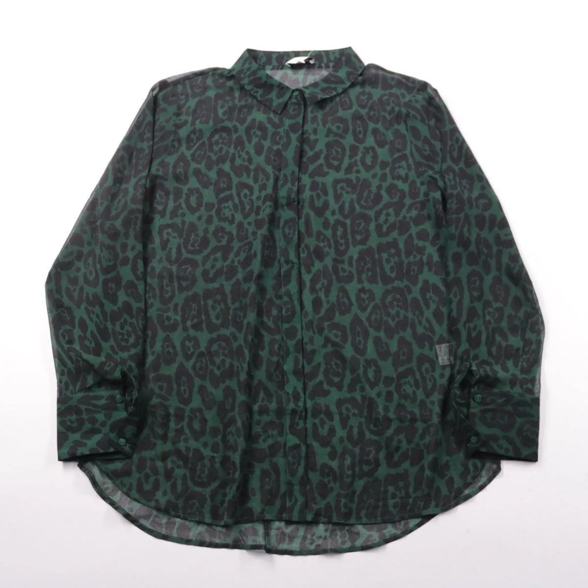 Женская рубашка Warehouse с леопардовым принтом в зелёно-чёрной гамме и классическим отложным воротником. Подойдёт для повседневных образов и офиса с однотонными брюками или юбкой. Практичный плюс — лёгкий полиэстер, который быстро сохнет и не требует сложного ухода.