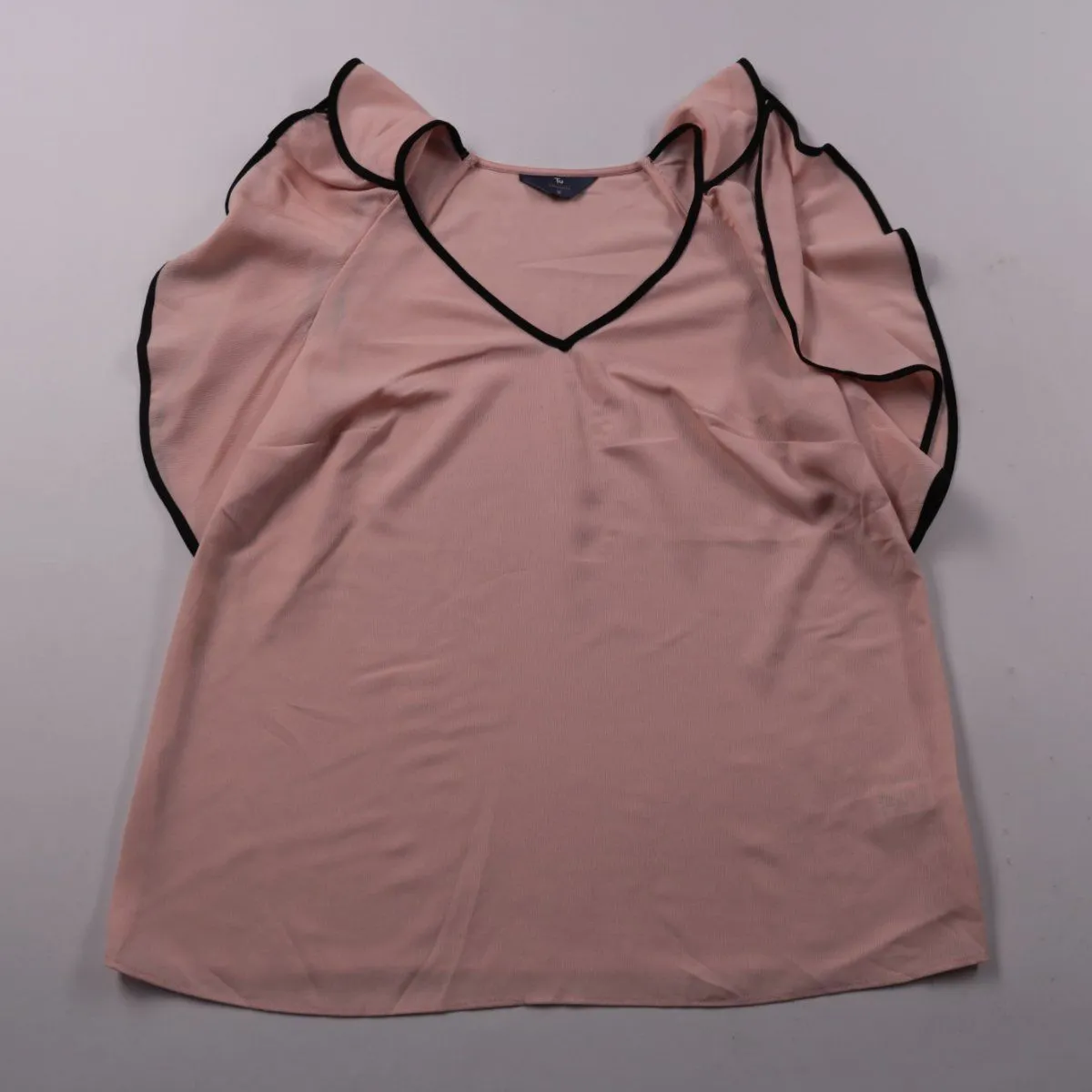 Лёгкая женская блузка TU нежно-розового цвета с чёрной окантовкой и V-образным вырезом. Подойдёт для тёплой погоды и офиса/повседневных образов, рукава оформлены воланами. Ткань тонкая и практически не мнётся, удобно носить в течение дня.