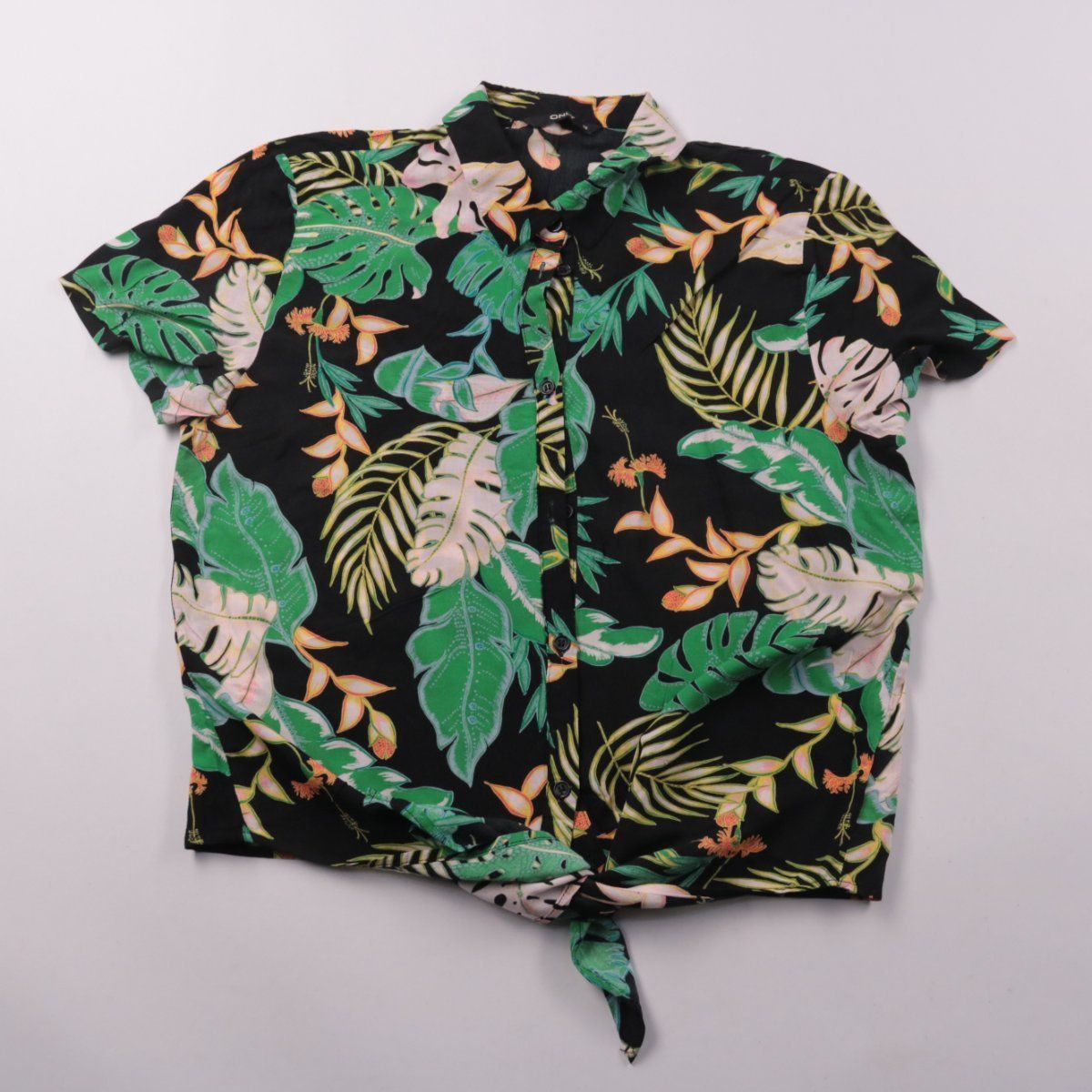 Женская рубашка Only с коротким рукавом и тропическим принтом на чёрном фоне, застёгивается на пуговицы. Подойдёт для лета и отдыха, можно носить навыпуск или завязывать низ узлом. Практична тем, что яркий рисунок легко сочетать с однотонными шортами, джинсами или юбкой.