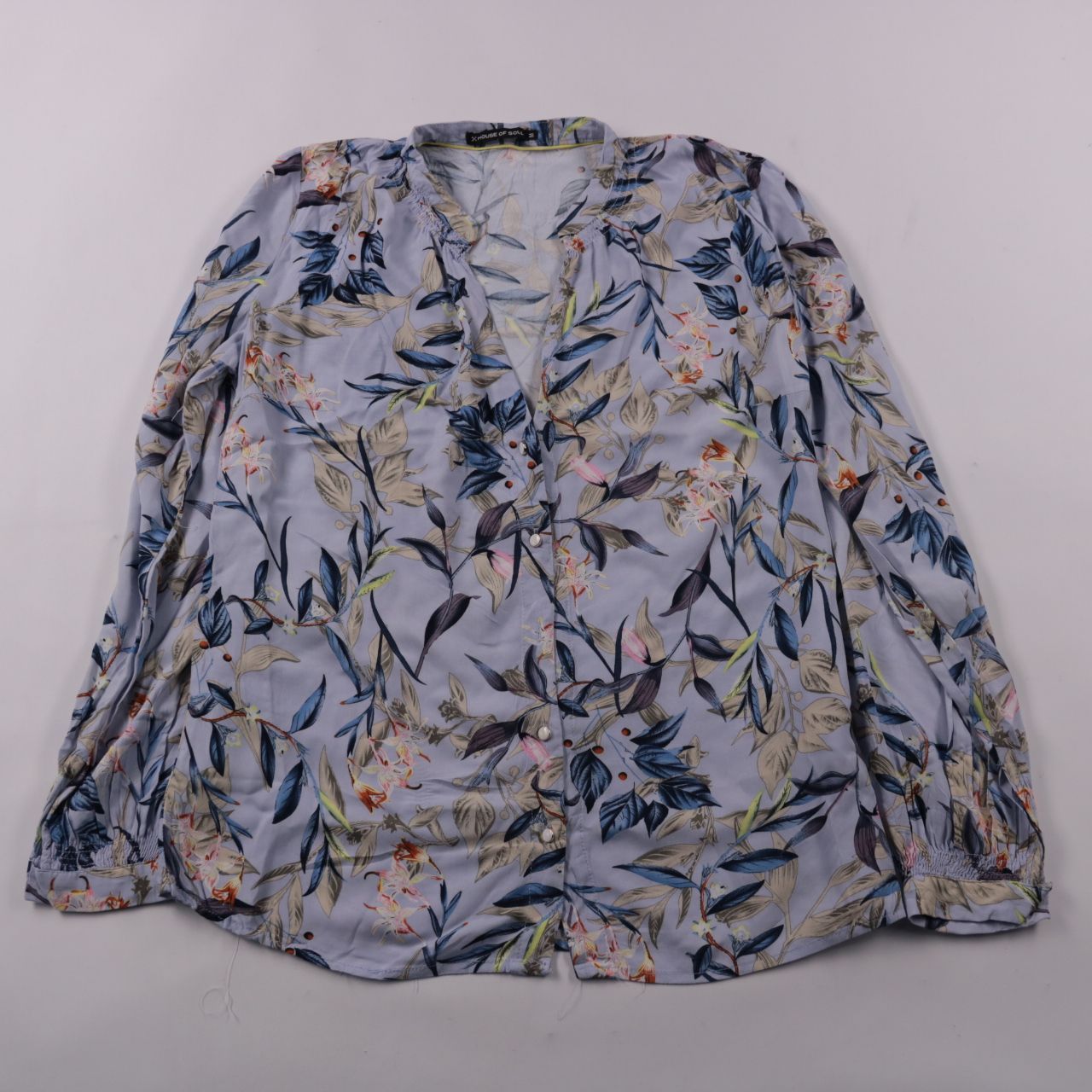 Женская блузка House of Soul из вискозы, светло-голубая с цветочным принтом и застёжкой на пуговицы. Подойдёт для офиса и повседневных образов в тёплое время или в качестве слоя в демисезон. Вискоза приятная к телу и хорошо дышит.
