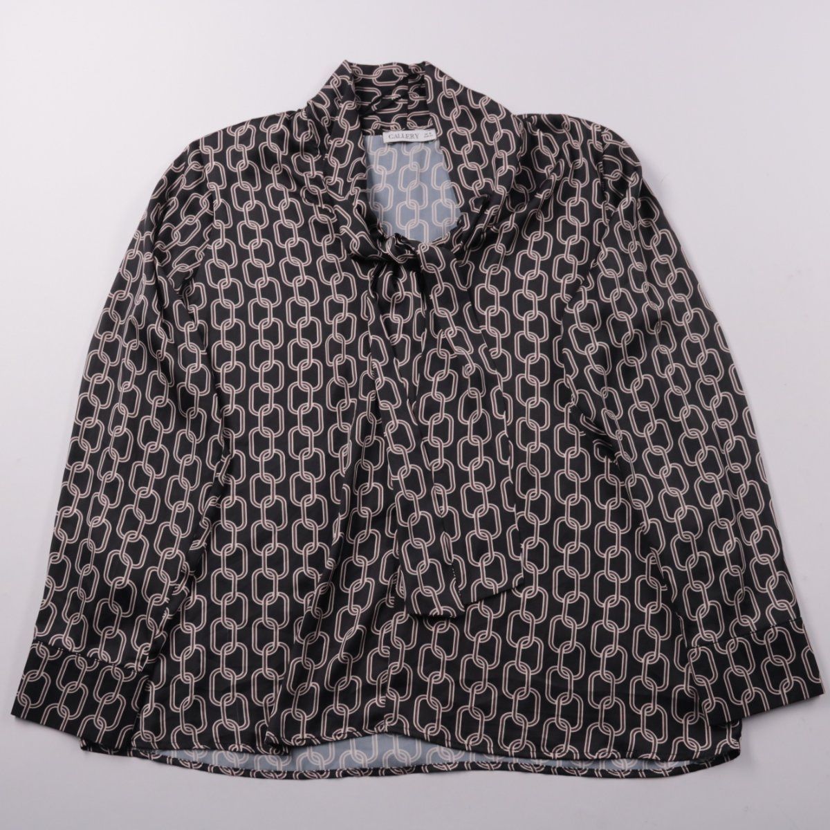 Блузка Gallery из полиэстера с принтом «цепочки» и воротником с завязками-бант. Подойдёт для офиса и повседневных образов с брюками или юбкой. Ткань почти не мнётся и легко стирается.