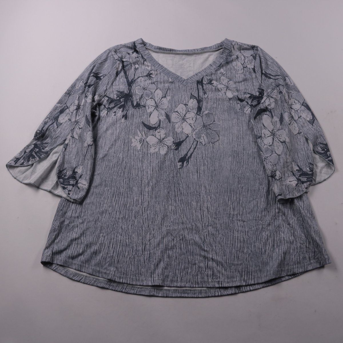 Женская блузка свободного кроя с V-образным вырезом и цветочным принтом. Подойдёт для повседневных летних образов и для офиса в сочетании с брюками или юбкой. Ткань на основе полиэстера с эластаном хорошо тянется и почти не мнётся.