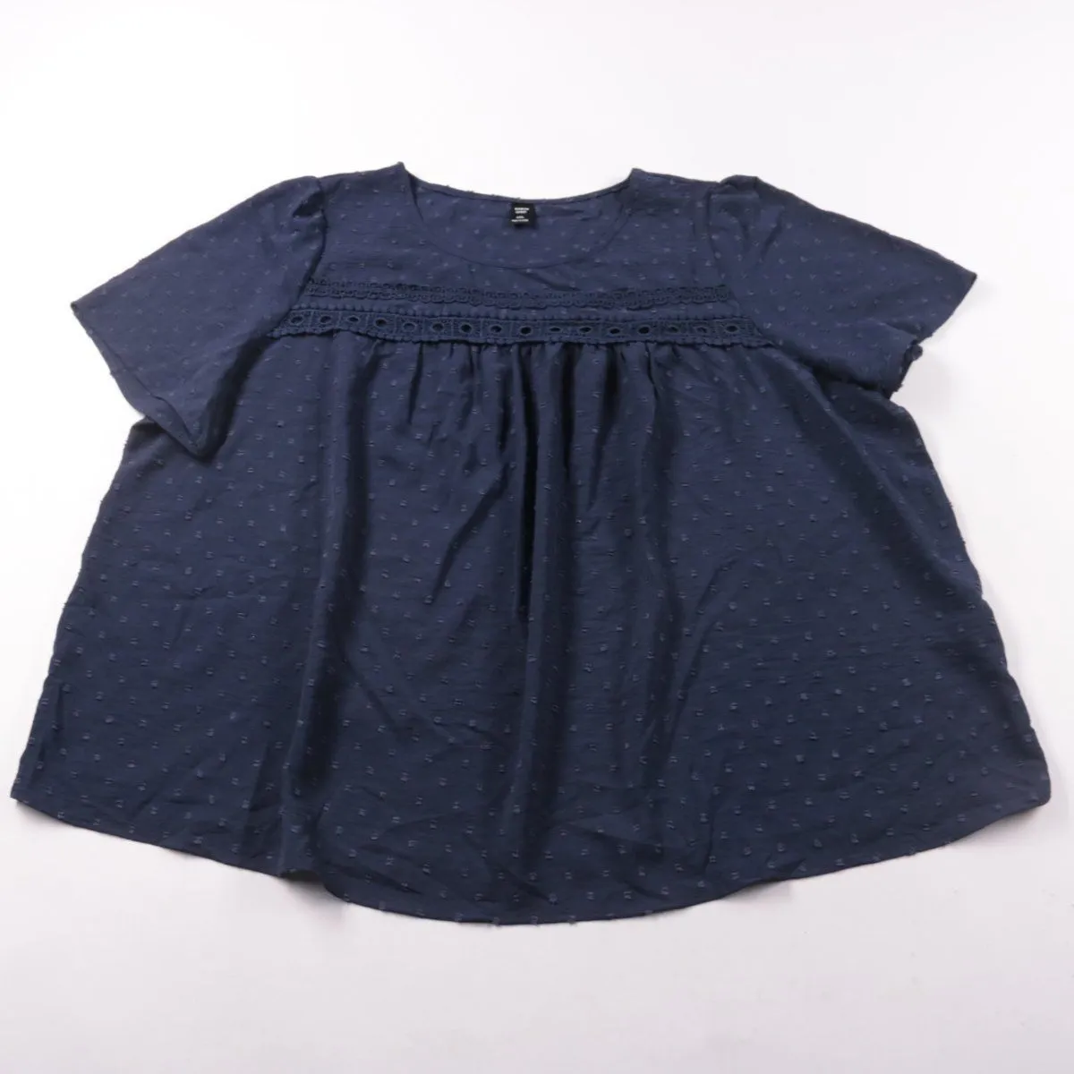Блузка SHEIN CURVE тёмно-синего цвета из фактурной ткани с кружевной вставкой на кокетке и сборками спереди. Подойдёт для повседневных летних образов и на выход благодаря свободному силуэту. Практичный плюс — лёгкий полиэстер быстро сохнет и проще в уходе.