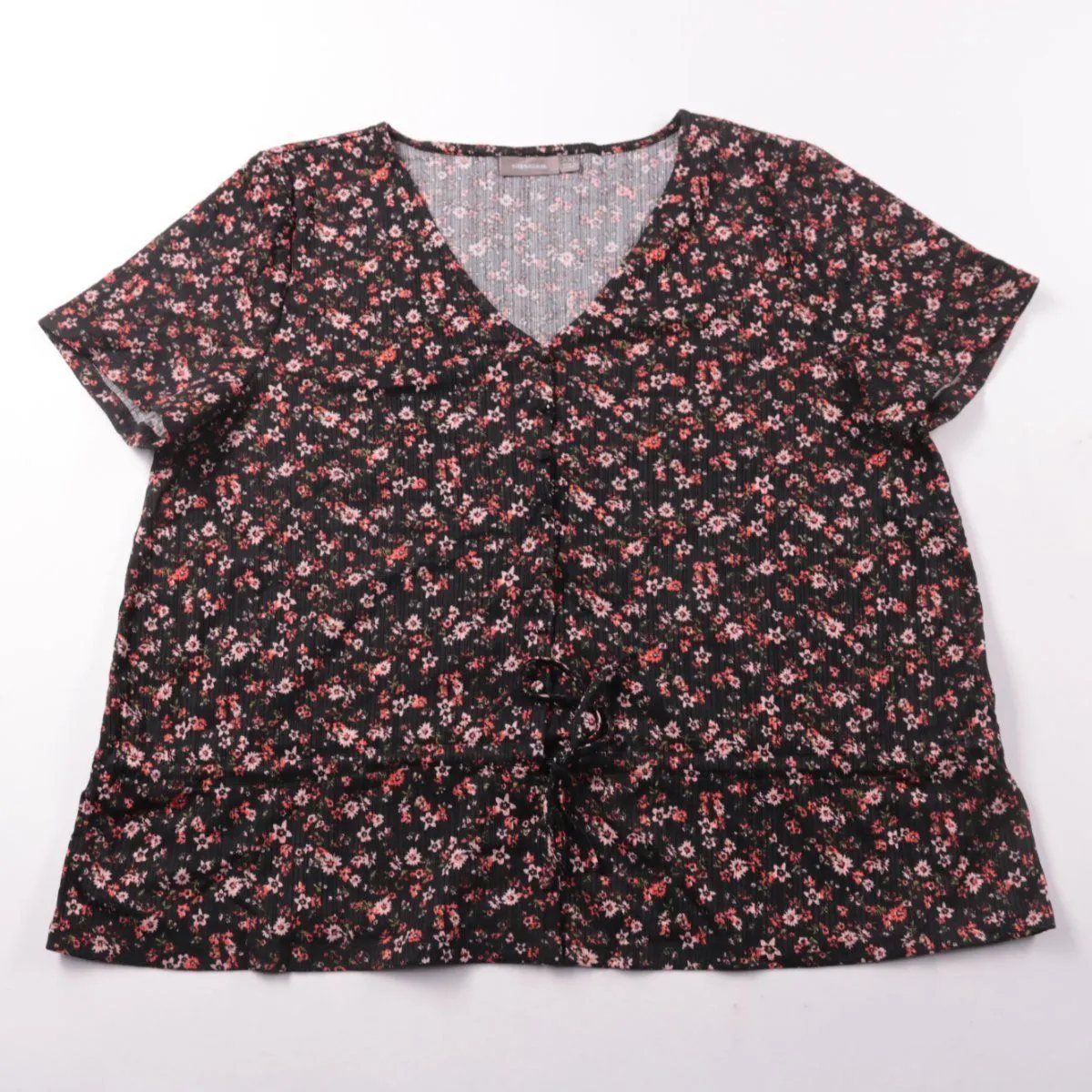 Женская блузка Sussan с V-образным вырезом и короткими рукавами, выполнена из ткани с мелким цветочным принтом. Подойдёт для тёплой погоды и повседневных образов, хорошо сочетается с джинсами и однотонными юбками. Материал эластичный, поэтому посадка комфортная.