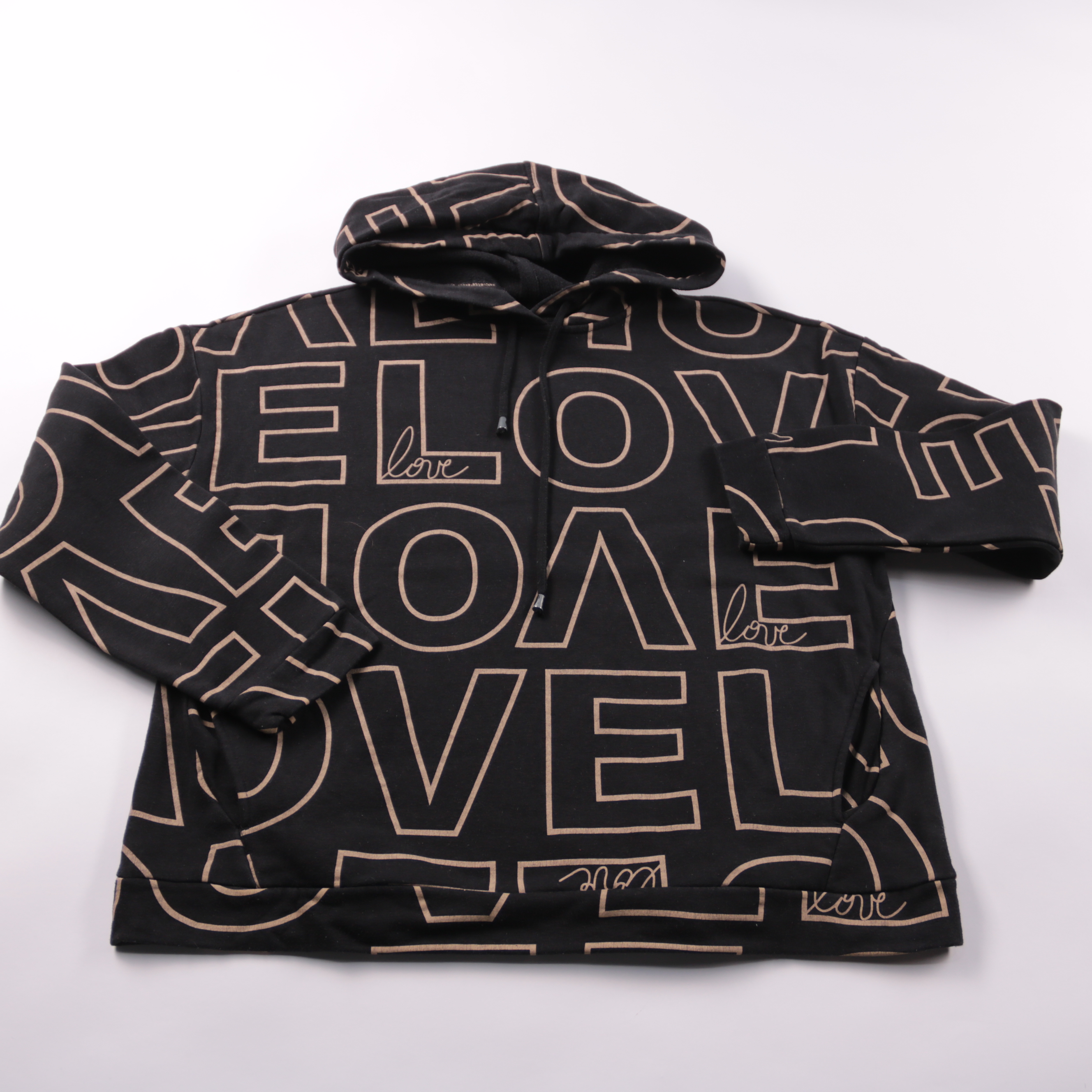 Толстовка Maxibluе чёрного цвета с капюшоном и крупным принтом LOVE. Подойдёт для повседневных образов и прогулок в прохладную погоду. Мягкая ткань с начёсом внутри делает её тёплой и комфортной.