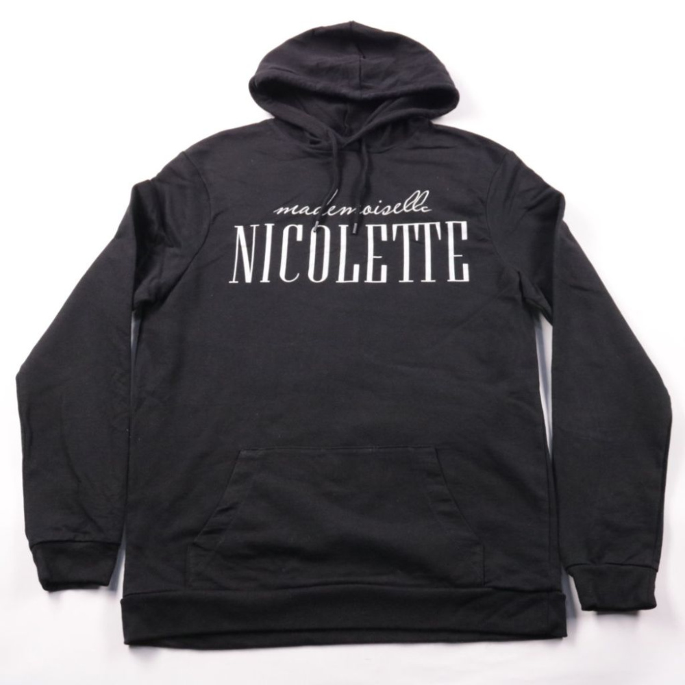 Худи Nicolette чёрного цвета с капюшоном и крупным принтом на груди. Подойдёт для повседневных образов и прогулок в прохладную погоду. Практичный плюс — вместительный карман-кенгуру и мягкий футер внутри.